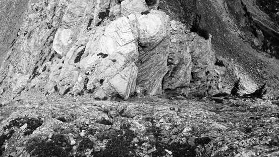 Even the descent down from the higher point by Buchanan Peak was not trivial. I should have stayed lower on skier’s right side of the ridge crest but by staying on the crest I had to overcome one awkward and super exposed section near the Buchanan/Carthew col. After this bit of excitement the real fun began as I slowly and steadily overcame one rock band after another. In general the easier line existed on climber’s right side but at least for the first few challenges staying directly on the ridge crest was still manageable, until I hit the crux wall.