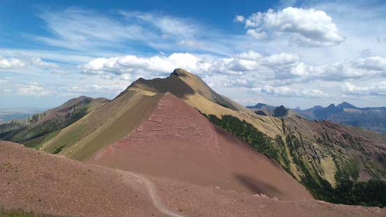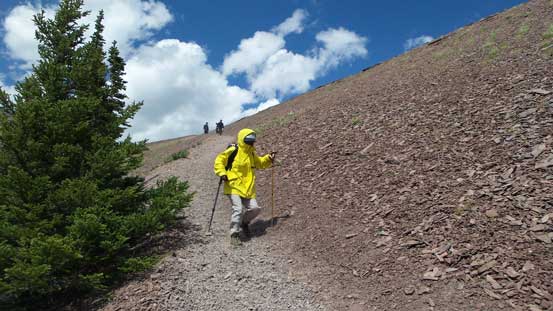 I didn’t linger any longer than necessary before starting the descent down the south side. There’s a beaten path leading the way and it was fast going. I thought I had to ascend up and over the false summit but once getting close I saw a path on an obvious scree ledges so went diagonally down. It was nice and easy and soon I joined my mom at Carthew’s shoulder and resumed the descent. We took a few short-cuts down the scree as it’s considerably faster. Once back on the trail the real plod began (7.6 km), but at least mostly down-hill.