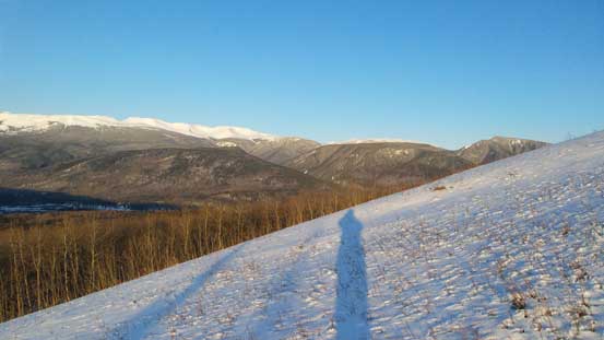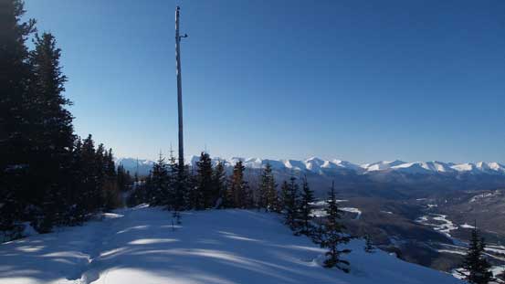 It wasn’t easy to locate the trail-head and even if I found it I couldn’t drive to the “proper” parking lot (as per the brochure) since the side roads were not free of snow/ice. I just parked on the highway shoulder. After walking back-and-forth a bit I eventually found the trail-head sign. Apparently snowmobiles had gone up it but due to the recent dump I still had to break trail, just not as bad as I was expecting. There’s little to say about the ascent itself since the trail essentially follows a cut block/power line all the way up and it was very wide. By constantly looking back I could always see the snowy mountains which was good. Directly behind was Lightning Ridge that I ascended last winter.