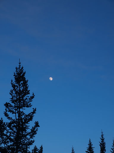 Up we went in the late afternoon. The trail was easy to follow, and apparently it was broken by previous snowshoeers, maybe from a week or so ago. Like the trail on Mt. Louie, this one was also very long and boring. It took us forever to finally get some views through the trees. By that time it was already getting dark, but thankfully the sky had cleared up, and we were shone by moon light. It was a full moon, and we could clearly see everything without the aid of head-lamp. Eventually we made to the saddle below Mt. Stearn, and we decided to set up camp in the trees on the right side. By this time we had already gained 1500 m elevation on Friday combing Mt. Louie and this approach.