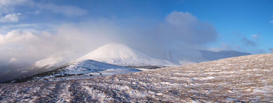 This slope was a lot longer than it looks. Once we topped out above, wind suddenly picked up to crazy. We ditched snowshoes, hoping the highpoint would be the summit. Wrong again!… The summit was actually the next highpoint on the ridge system, involving a lot more elevation gain and regain. The wind speed was actually tolerable, and we could keep our balance without being blown down. However, unlike the chinook in Kananaskis, the wind here was much colder. I soon took out my ski goggles and balaclava. I was very glad to have them on this trip. We kept trudging in a near white-out condition, being blown by the gusting wind and smashed by the ice crystals. We went up and over the false summit, and I ditched backpack at the last col. The final slog along summit ridge took forever, and once we topped out on the summit, the sky magically cleared up a bit, revealing some sort of views.. Well, that’s better than nothing.