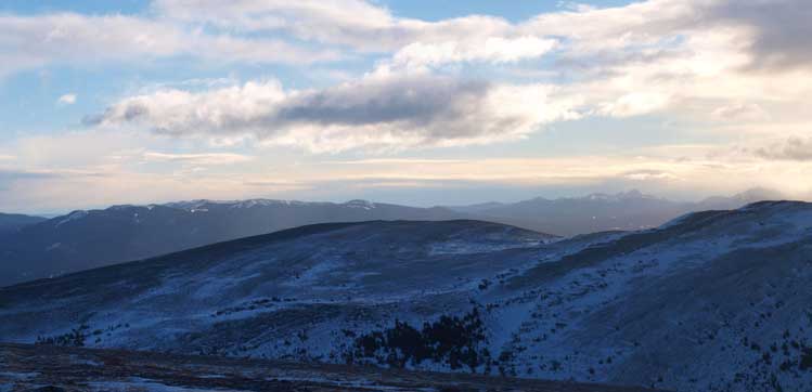 Snowshoeing down the big hill was fast and fun. Now the sky was almost completely cleared up towards east, and we could take time soaking in the views. We went up and over the bumps on the connecting ridge which proved to be much faster than our ascent route. Ben and I had some discussion whether attempting Mt. Stearn or not. We opted for not, as we didn’t want to survive another night here, and we were definitely running out of time and energy. Eric was behind us but I was sure he didn’t want to do Stearn neither, as he had already done it…