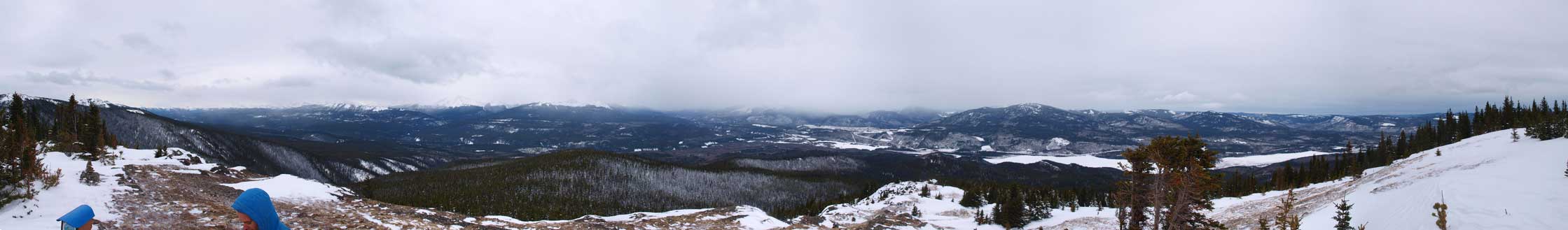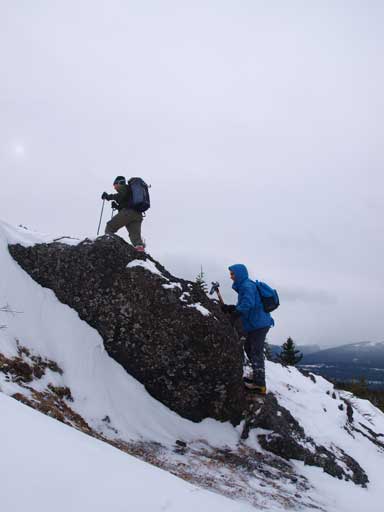 Although snow covered, the trail wasn’t too hard to follow. However, the route was much more challenging than expected. The lower part was nothing but snow covered rocks. The snow was too shallow for snowshoeing, but we didn’t know how deep was the snow higher up. Ben and I didn’t want to damage our shoes so we ditched them not far up, while Eric kept his snowshoes on. Knee deep post-holing soon started to punish us, but further up terrain became snow covered rocks again. In general it wasn’t a bad call for leaving our snowshoes behind. The sugary snow offered no support, and everybody sank to its bottom with or without snowshoes. The ridge went on forever, and it felt like eternity to finally break through the trees. Technically we didn’t reach treeline though as the summit was partially treed. Wind also picked up considerably. Eric brought his Passport for the Peaks guidebook, but it was almost impossible to stamp his page in this strong wind. He almost managed to lose several pages.