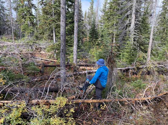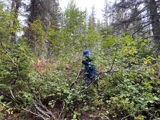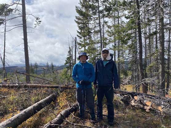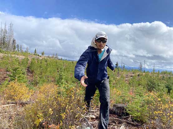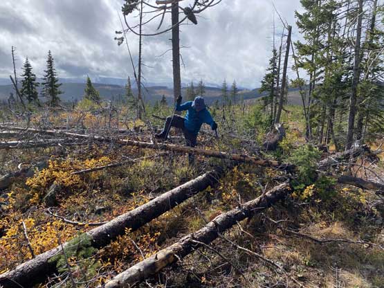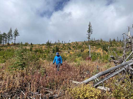 The drive had taken forever but the ascent was shaping up to be another no-brainer one, which both of us were happy about. The weather was also clearing revealing some patches of blue skies. After walking along the deactivated spur to the end we took thrashed a short ways across a cut-block to what we thought was the highest point. We took some victory photos but the map showed the peak was located a few hundred meters to the west. We bashed our ways there across some unpleasant dead-falls fields because we really had no other choice. Once there we were disappointed that the “summit” was definitely lower than the one we were standing on, so this time the map was wrong.