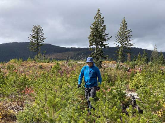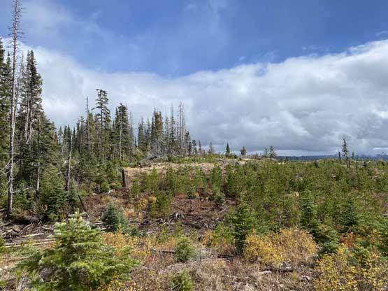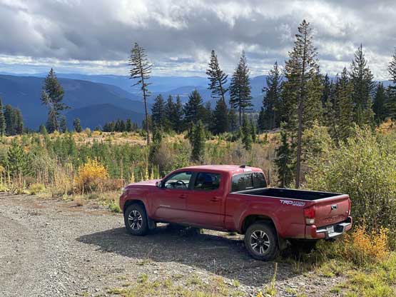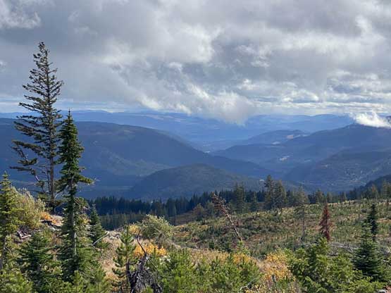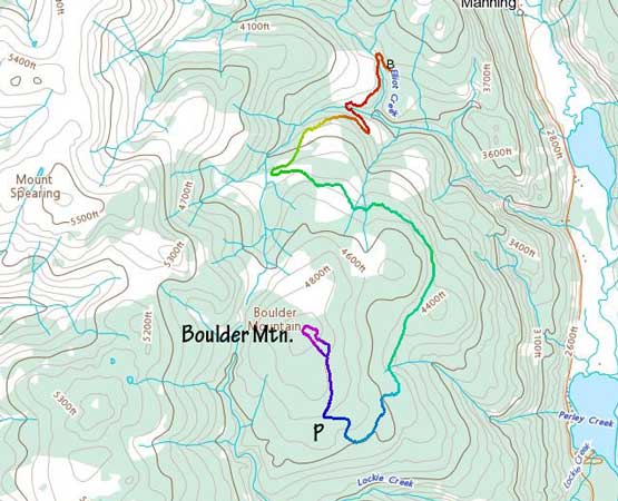 On the descent I led us taking a direct route down towards the highest spur roads and successfully bypassed the dead-fall fields. We then easily walked back to the truck. After a lunch break we carefully drove about halfway down the Boulder Mountain FSR system and took a left turn upon reaching a critical junction as that would put us closer to the summit of Mt. Spearing, the highest peak we bagged in this trip.