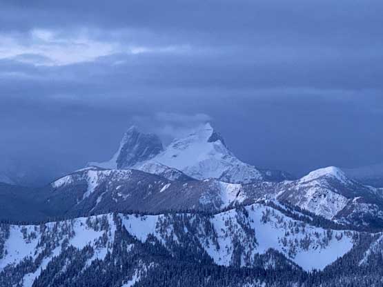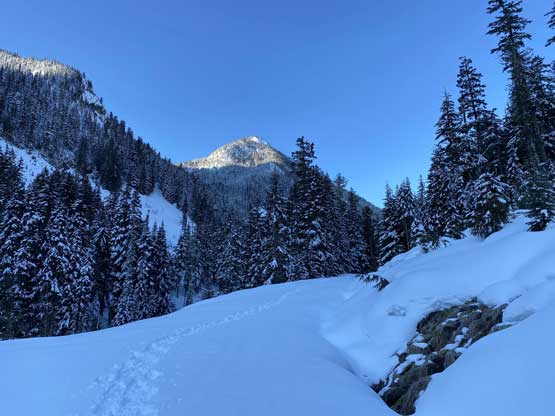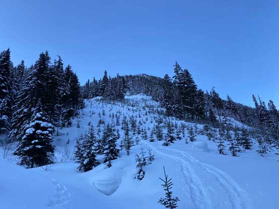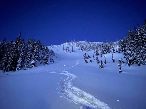 I had come prepared with earphones because I knew the battle against fatigue, darkness, coldness and the boredness of this initial road plod (with zero sleep and a tiring 2+ hours drive) would be the crux. I donned snowshoes right off the bat. Al and Ashkan’s tracks were very visible so all I needed was to put one foot in front of another. There was more elevation gain on this road than I had remembered from a couple years ago when I did Silverdaisy, Claimstake and Hatchethead Mountains. The grade was almost consistent uphill. I plodded at a moderate pace and finished the 5-km approach in 1 hour 20 minutes. The track then did a short but steep descent to cross Smitheram Creek on a solid snow bridge before ascending steeply up what seemed like a cutblock. Al’s group had made some nice switchbacks on the uphill travel and (smartly) chose to not follow the uptracks on the descent so the tracks were well preserved for me. A while later the cutblock gave way to the mature forest and the grade eased off a bit. At this point the track was paralleling the creek on the south side but soon bailed into the creek. The travel was nice and pleasant. Further up the creek became what appeared like a narrow mini-canyon with steep walls on both sides. One downed tree required me to detour on climber’s left side but other than that, the travel was still pleasant and soon enough, I popped out in a bowl. In the pitch dark I followed the nicely laid out uptracks zig-zagging up a slide path (35+ degrees) and then traversed diagonally rightwards into the next basin. The sky finally brightened up a little bit.