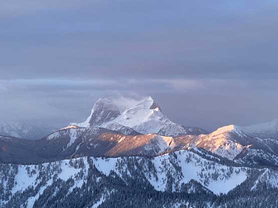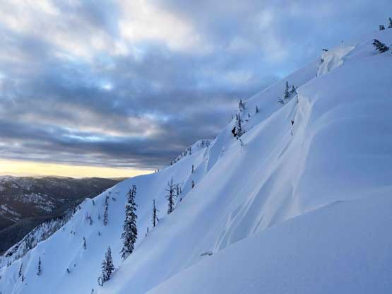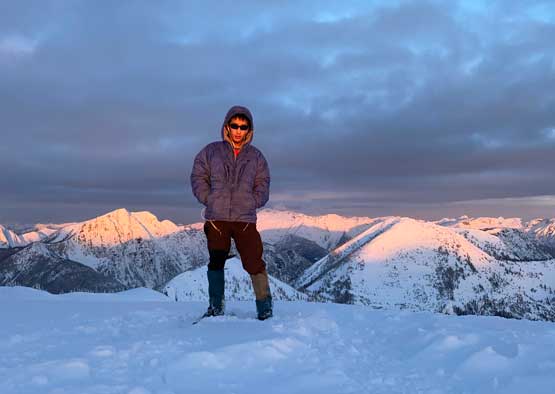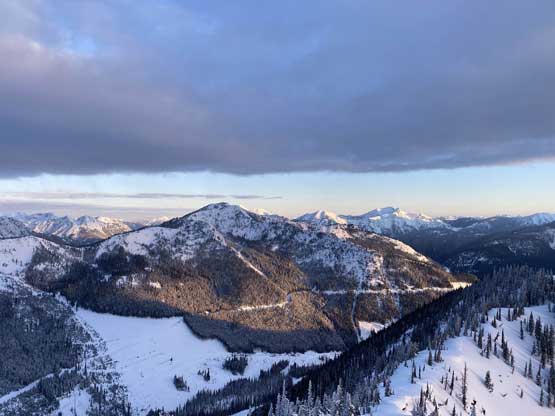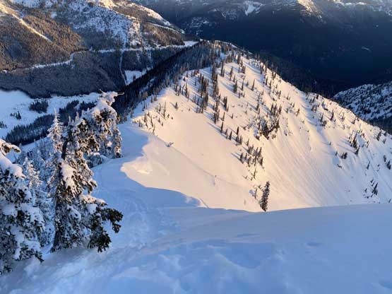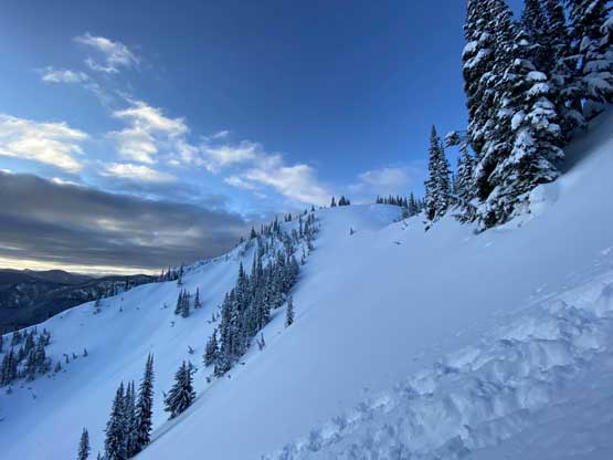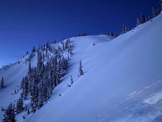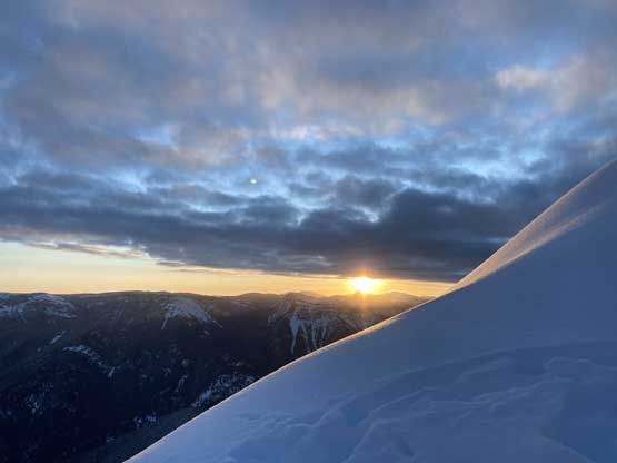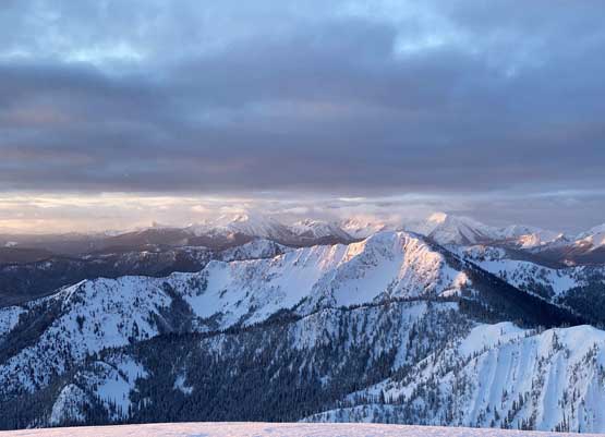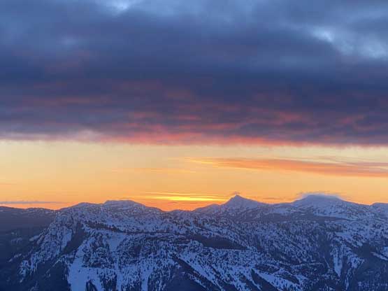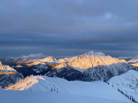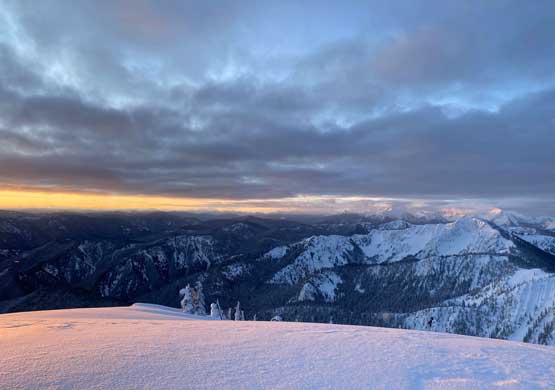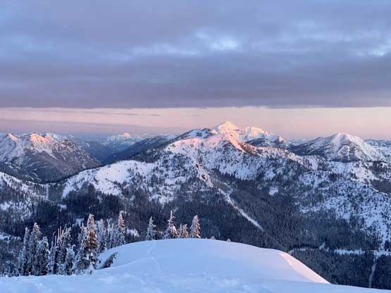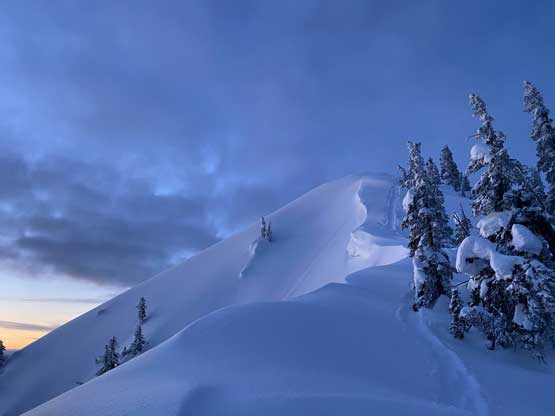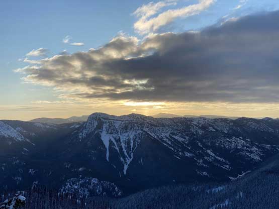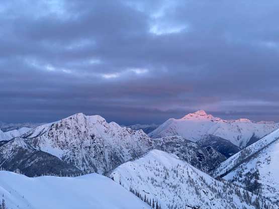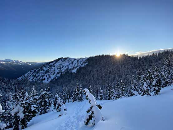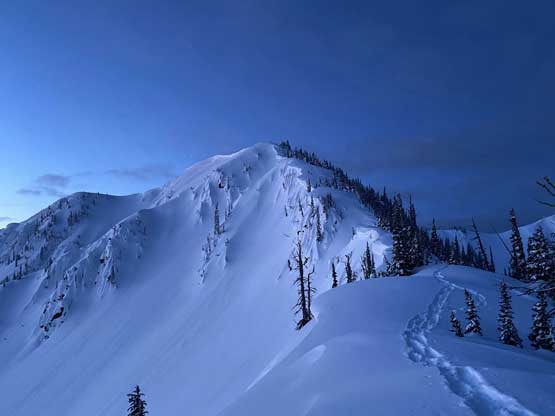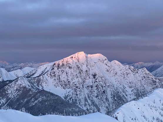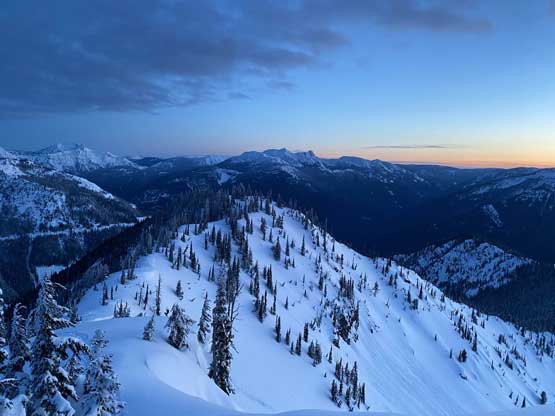 The terrain was bigger than anticipated so I couldn’t help but to pick up the pace, crushing the next stage in a timely manner to top out on the north ridge of Eastpoint Peak. The exit of this bowl onto the ridge involved a long stretch of 40 degree snow. At this point the sky was bright enough to snap a couple more pictures but still a long ways from sunrise. I hadn’t taken any break yet but the coldness and the anticipation of a sunrise summit kept me pushing at a fast pace. I followed the tracks over a few steep rolls and then over the false summit with some minor elevation loss. The summit ridge looked steep but feasible. There were two odd, 45 degree stretch that required some detouring or “technical snowshoeing” with moderate exposure. I even grabbed a tree branch to haul myself over a tricky step.