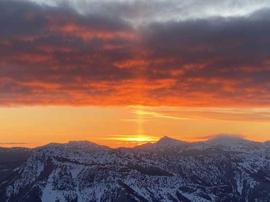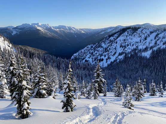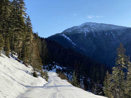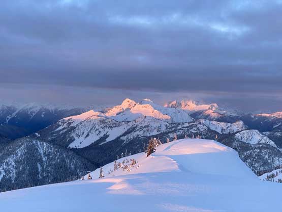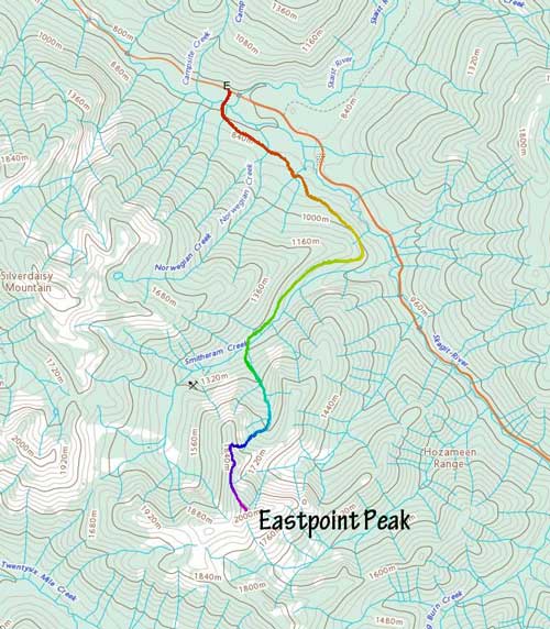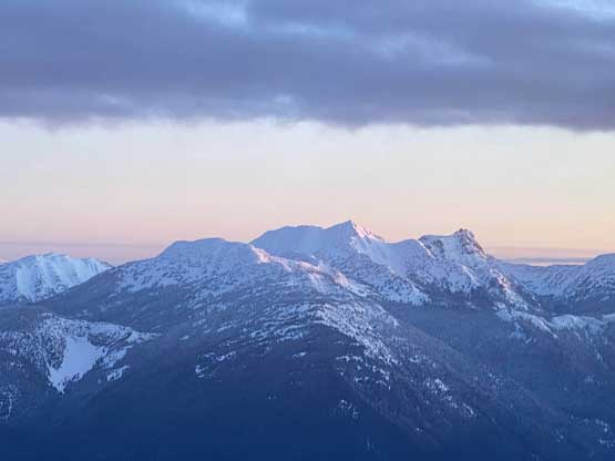 I wasn’t planning to go out on this past Thursday but I changed my mind at 10 pm Wednesday night after hearing that my friend Alan Blair had just packed down a snowshoe track to the summit of Eastpoint Peak. This is a medium-sized peak by Manning Park standard so not super attractive, so despite the fact it had been on my radar for several years I always ended up doing something else. There was no more excuse this time. I knew this would be a longish drive for squeezing in a “before work exercise” but I accepted the challenge nonetheless. There aren’t a ton of beta about Eastpoint Peak online and the (only two or three) detailed trip reports were summer ascents via west ridge on the old ClubTread forum. The west ridge made a lot more sense back in the days when the old mine road was drivable to the pass with “Claimstake Mountain” but nowadays just to reaching the pass involved 10 km of mind-numbing plod, making the ascent a fairly long day-trip. Al had apparently done his homework and explored a new route up the north ridge and I agreed that his found the most efficient route to reach this summit. This route only makes sense in winter or spring when deep snowpack covers the brushes.