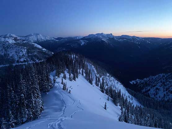 The terrain was bigger than anticipated so I couldn’t help but to pick up the pace, crushing the next stage in a timely manner to top out on the north ridge of Eastpoint Peak. The exit of this bowl onto the ridge involved a long stretch of 40 degree snow. At this point the sky was bright enough to snap a couple more pictures but still a long ways from sunrise. I hadn’t taken any break yet but the coldness and the anticipation of a sunrise summit kept me pushing at a fast pace. I followed the tracks over a few steep rolls and then over the false summit with some minor elevation loss. The summit ridge looked steep but feasible. There were two odd, 45 degree stretch that required some detouring or “technical snowshoeing” with moderate exposure. I even grabbed a tree branch to haul myself over a tricky step.