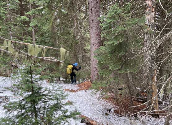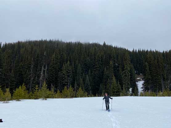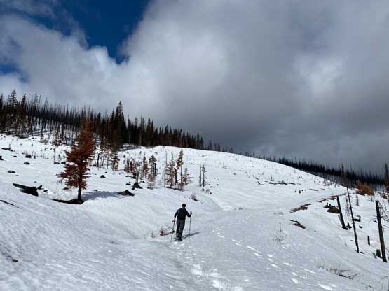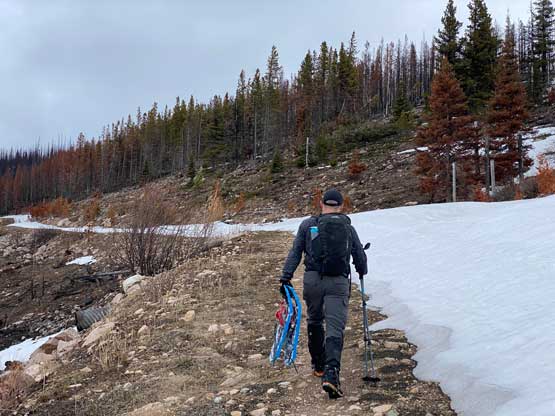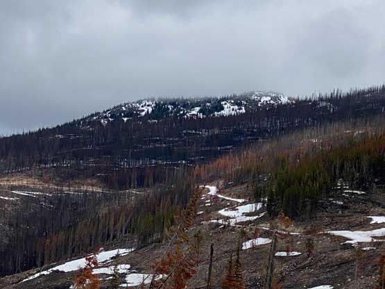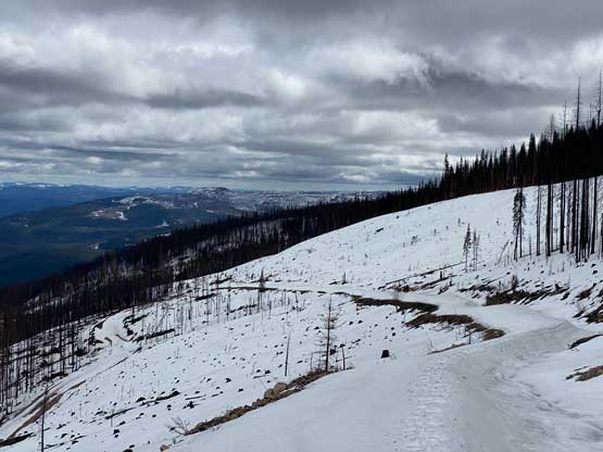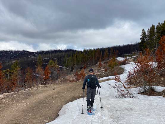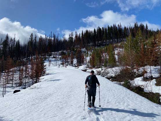 After the clouds rolled back in we started the descent. We stayed more on skier’s right near the creek to avoid snowshoeing on dry terrain. The price we paid was more bushwhacking. The plod back across the FSR was mostly uneventful until we decided to take a short-cut below that 1600m saddle. The short-cut led us into some burnt forest with light bushwhacking. I don’t know if we actually saved much time, but this definitely added some variety into the otherwise, mundane plod. Our round trip time was 4.5 hours covering over 16 km distance. I eventually got back home at 4 pm earning an hour’s nap before dinner and my evening work.