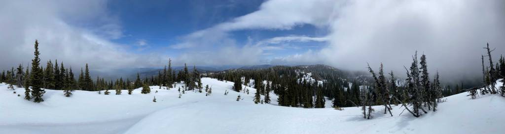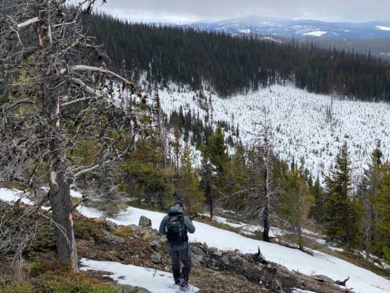 We strapped the snowshoes back on and descended slightly into the drainage directly under Fig Peak’s summit. We crossed the creek on a log, took a long break and committed to the final 250-m grunt on the south slopes. The grunt started with some light bushwhacking but soon gave way to open slopes. Route-finding in micro-terrain was required the whole way up as the snow was not very continuous anymore. We managed to keep the snowshoes on our feet the whole way up but did have to snowshoe up some dry patches. The ascent was also longer than expected with a few false summits coming up. The weather was mostly cloudy but did clear up briefly while we were on the top.