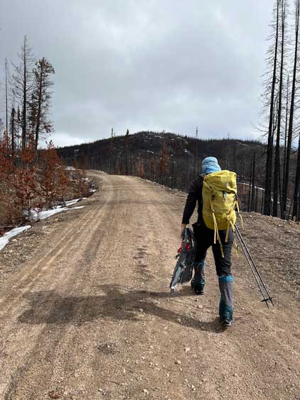 The first stretch of dry road requiring carrying snowshoes