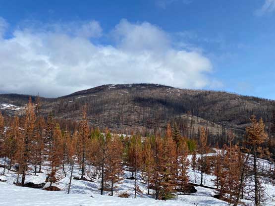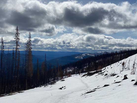 After the clouds rolled back in we started the descent. We stayed more on skier’s right near the creek to avoid snowshoeing on dry terrain. The price we paid was more bushwhacking. The plod back across the FSR was mostly uneventful until we decided to take a short-cut below that 1600m saddle. The short-cut led us into some burnt forest with light bushwhacking. I don’t know if we actually saved much time, but this definitely added some variety into the otherwise, mundane plod. Our round trip time was 4.5 hours covering over 16 km distance. I eventually got back home at 4 pm earning an hour’s nap before dinner and my evening work.