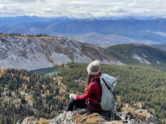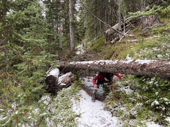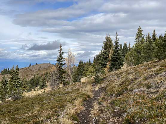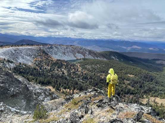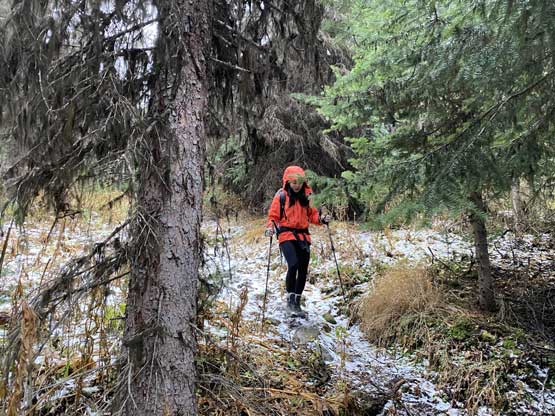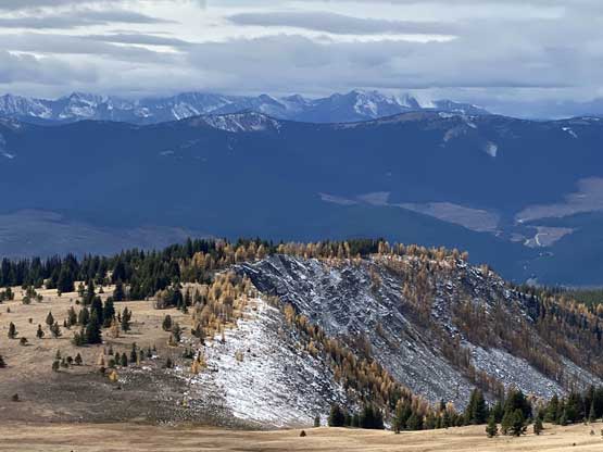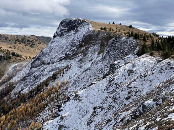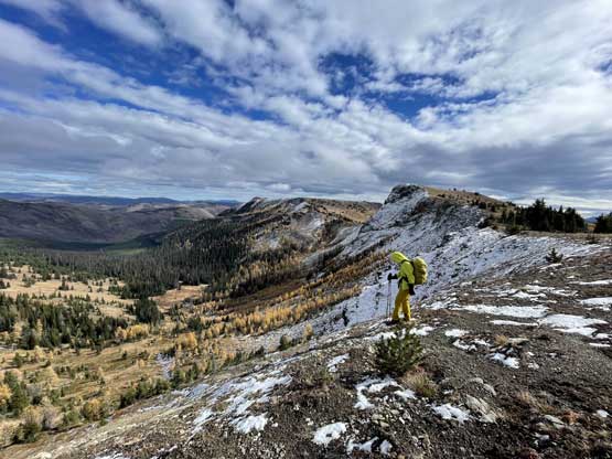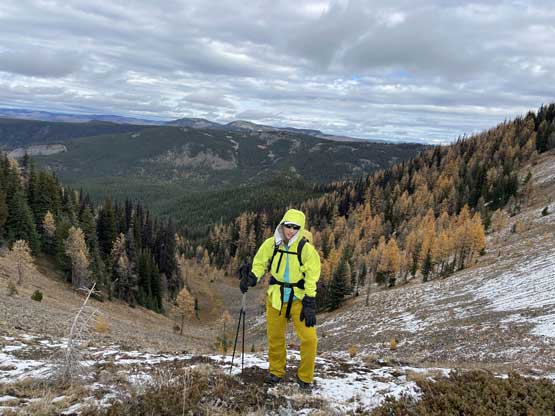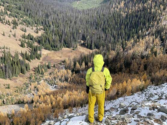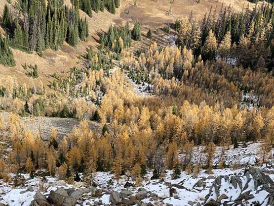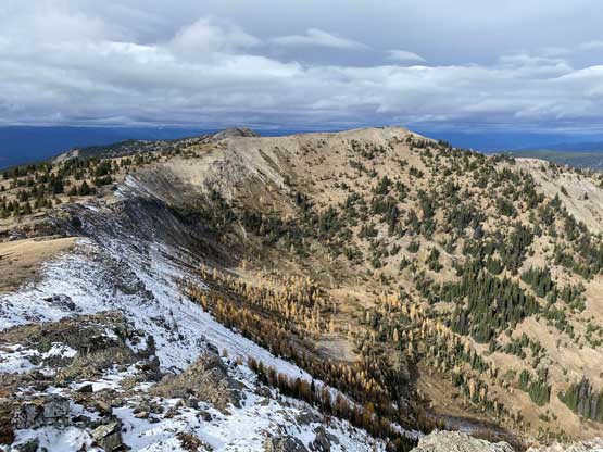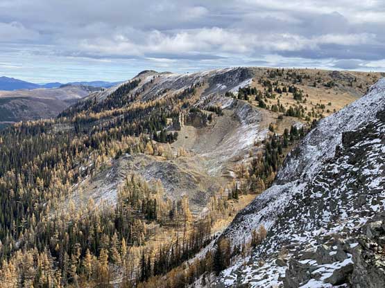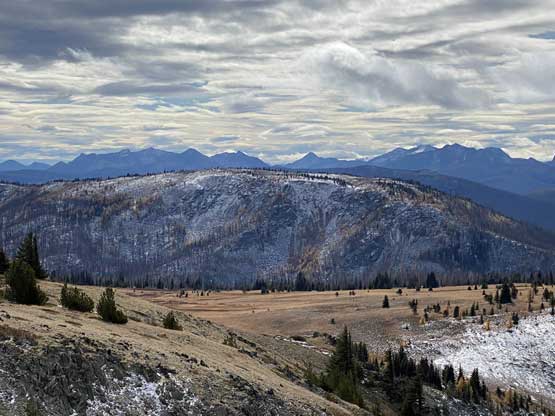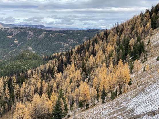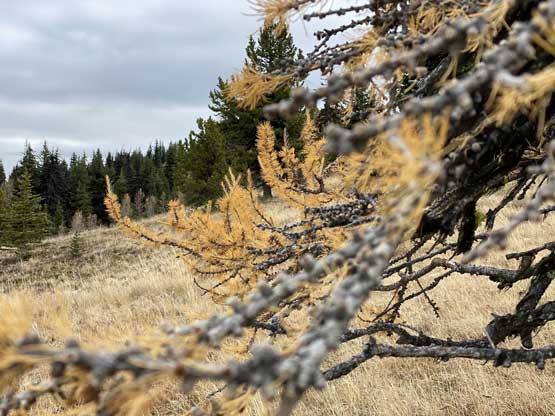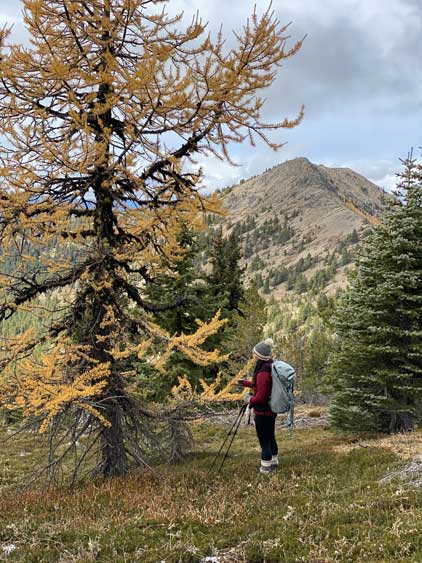We started hiking in some light flurries but the precipitation stopped soon. In short time we made to Placer Lake. The view wasn’t as good so we found the trail and carried on. The next stretch was decently steep, covering over 300 m gain in just a bit over 1 kilometer. There were also a few annoying dead-falls to duck underneath or hop over. Eventually the trees thinned out and the views opened up at around 2050 m elevation and we started to plod across flat meadow areas. It’s at this point that we noticed the golden larches around. There weren’t a lot, but enough to give hope for the higher up zones. I had never heard Flat Top Mountain as a larch-hunting destination so this was a pleasant surprise. The trail then traversed across the south side of a subsidiary bump for a long while and once that’s over we reached a saddle. It was cold and windy, but the north side had a ton of larches that certainly boosted our motivation.