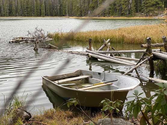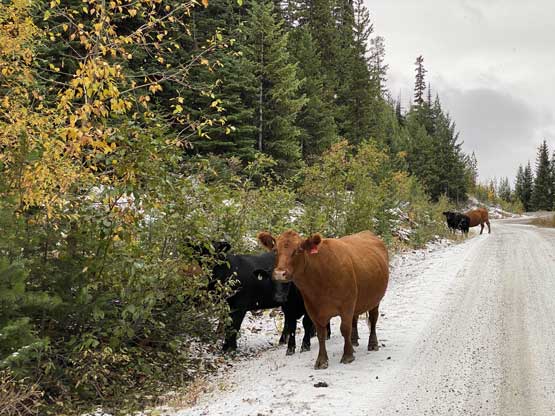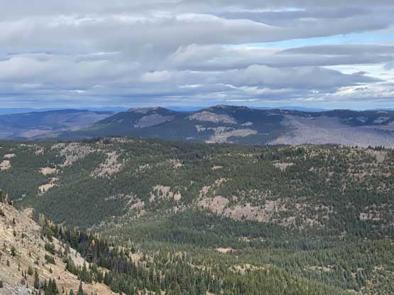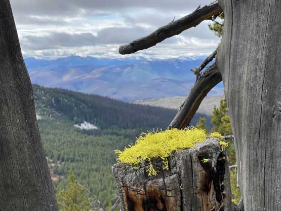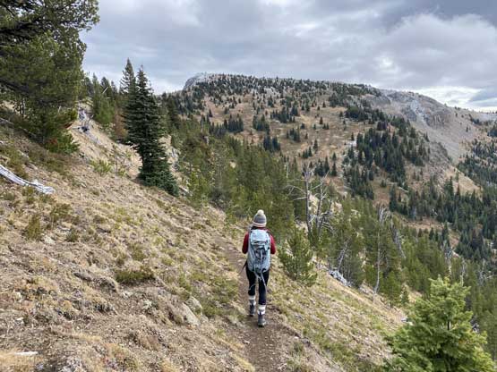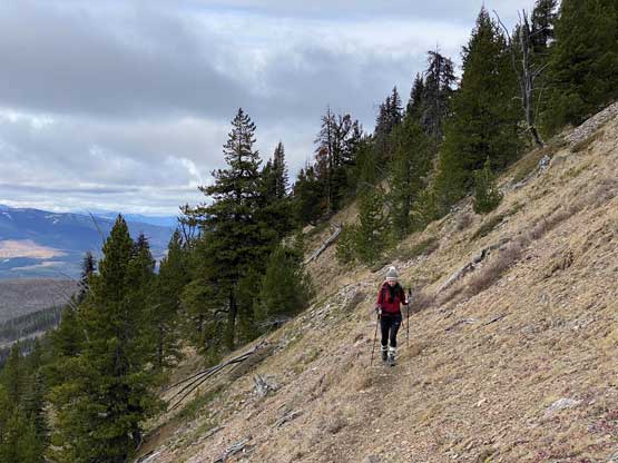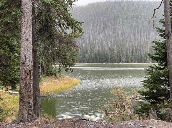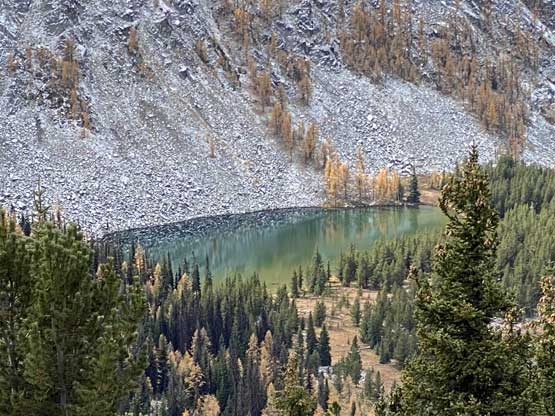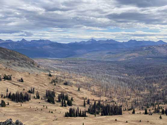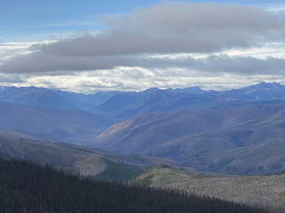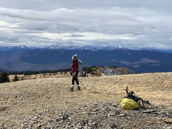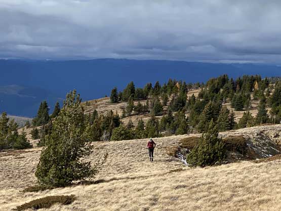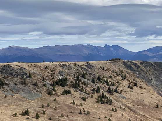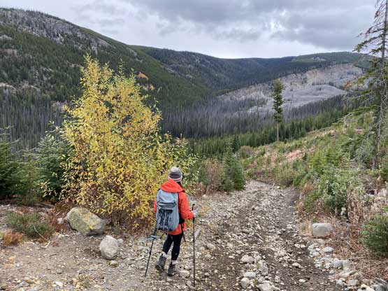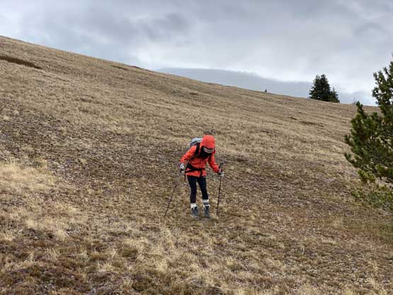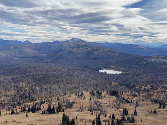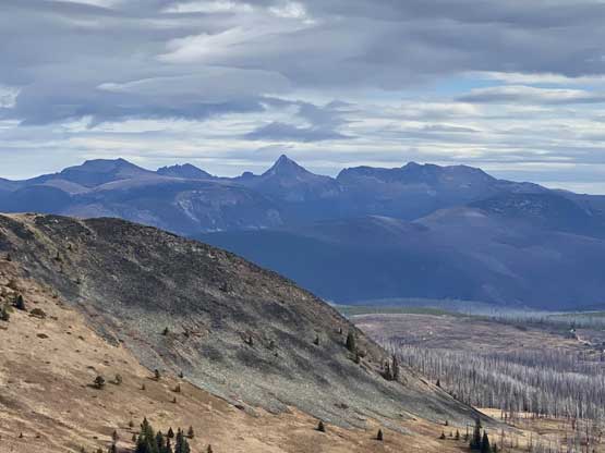 We started hiking in some light flurries but the precipitation stopped soon. In short time we made to Placer Lake. The view wasn’t as good so we found the trail and carried on. The next stretch was decently steep, covering over 300 m gain in just a bit over 1 kilometer. There were also a few annoying dead-falls to duck underneath or hop over. Eventually the trees thinned out and the views opened up at around 2050 m elevation and we started to plod across flat meadow areas. It’s at this point that we noticed the golden larches around. There weren’t a lot, but enough to give hope for the higher up zones. I had never heard Flat Top Mountain as a larch-hunting destination so this was a pleasant surprise. The trail then traversed across the south side of a subsidiary bump for a long while and once that’s over we reached a saddle. It was cold and windy, but the north side had a ton of larches that certainly boosted our motivation.