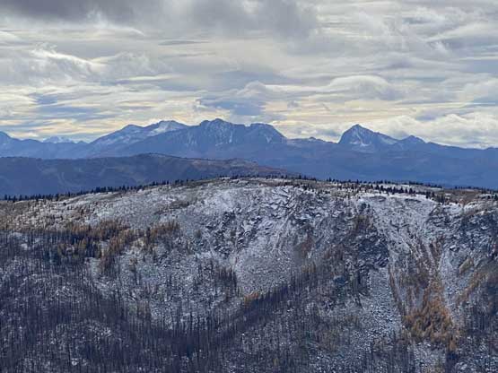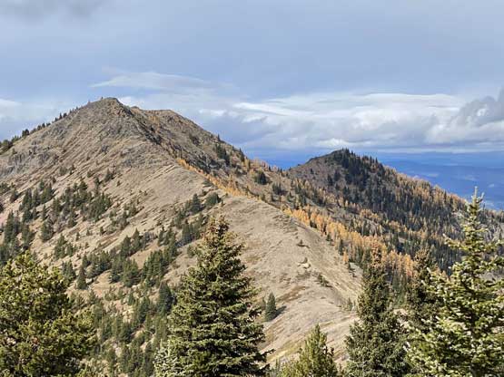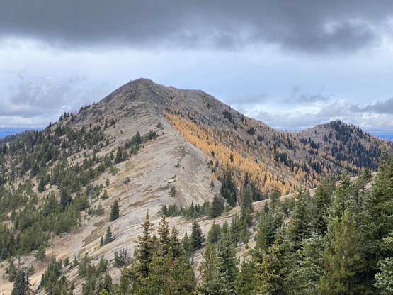 And then the cloud layer gave way to intermittent sunshine. We followed the trail traversing across the next bump to the broad NW Ridge of the final peak. The north side of this next saddle offered even better larches scenery. We took our time taking photos and then dashed to the summit. The final few hundred meters were off-trail. I sped up because I saw bands of clouds moving in rapidly and we managed to summit literally 3 minutes before losing sunshine. We then hiked south to find a sheltered spot to take the much-needed lunch break.