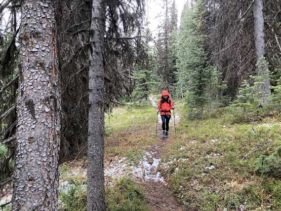 The descent was rather uneventful. Because of the cloudy weather we did not stop much for the larches views and the cold breeze kept us moving. I kept my winter parka on for a couple kilometers until I became warm enough. The snow and ice on the trail was mostly gone but the replacement was slippery mud.