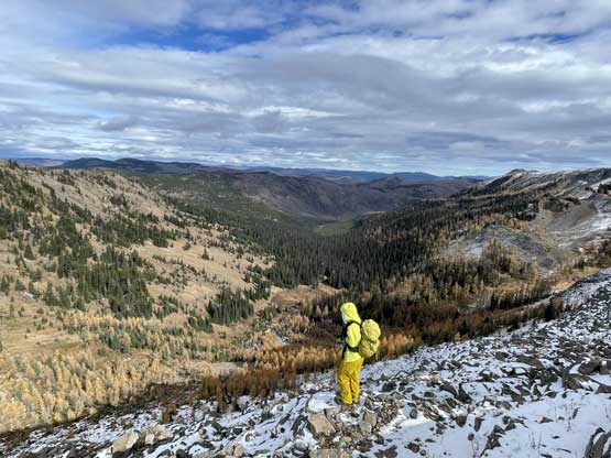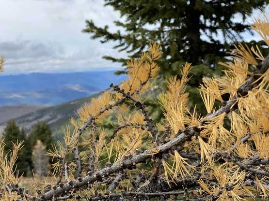 We started hiking in some light flurries but the precipitation stopped soon. In short time we made to Placer Lake. The view wasn’t as good so we found the trail and carried on. The next stretch was decently steep, covering over 300 m gain in just a bit over 1 kilometer. There were also a few annoying dead-falls to duck underneath or hop over. Eventually the trees thinned out and the views opened up at around 2050 m elevation and we started to plod across flat meadow areas. It’s at this point that we noticed the golden larches around. There weren’t a lot, but enough to give hope for the higher up zones. I had never heard Flat Top Mountain as a larch-hunting destination so this was a pleasant surprise. The trail then traversed across the south side of a subsidiary bump for a long while and once that’s over we reached a saddle. It was cold and windy, but the north side had a ton of larches that certainly boosted our motivation.