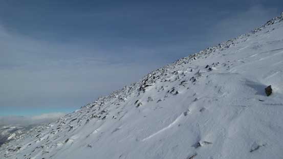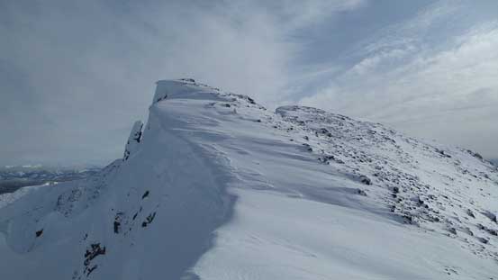 There were a few more rolls that I had to ascend through sparsely treed larch country and after that I made to a long and flat bench above treeline. My objective was straight in front and appeared nothing tricky, albeit there’s still a fair amount of elevation gain to cover. I snowshoe’d up another roll and then the ridge narrowed down with some increasing exposure to either side. The terrain ahead appeared rocky and corniced so the snowshoes were quickly ditched. At this point I thought it’d be an easy scree/snow plod to the summit but turned out a bit more involved. My soft hiking shoes performed poorly on the icy snow and it’s starting to get pretty sketchy. I was glad I brought my aluminum crampons even though I wasn’t expecting to use them.