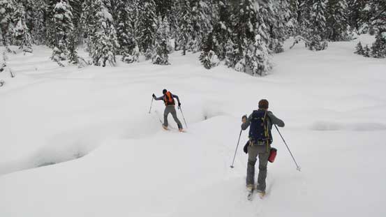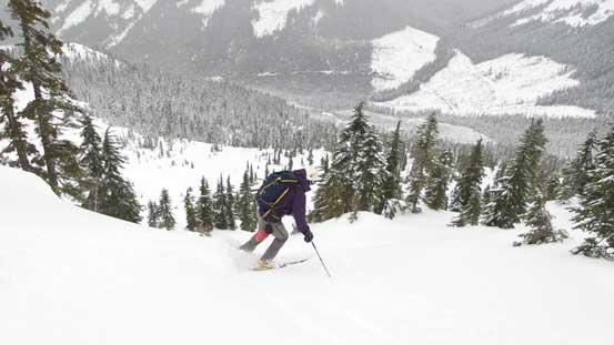 Ben knew this area very well so we just followed him. Instead of traversing to Great Bear Peak we did our first run down the broad N. Flanks of Iago Peak and it’s proved to be one of the best runs I’ve ever done. The snow condition was just ideal – no crust, no slush, just fine powder. There’s one steep gully near the top but the terrain soon levelled out to be mostly “intermediate” sparsely treed slopes. After finishing this run we put the skis back on and traversed back to Iago/Zupjok col, and then re-ascended Iago Peak following our skin tracks.