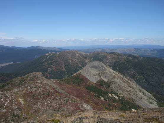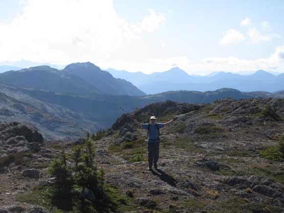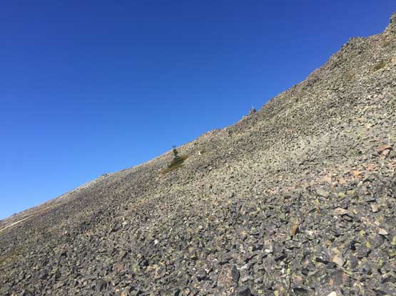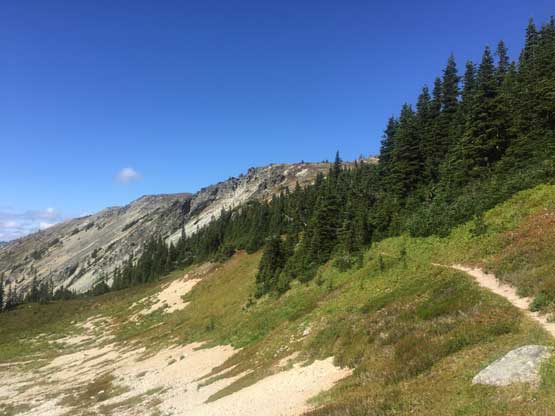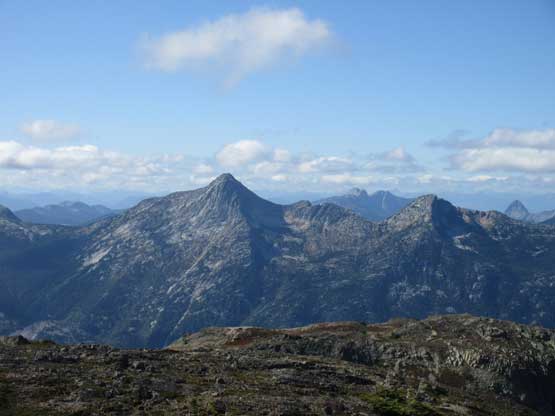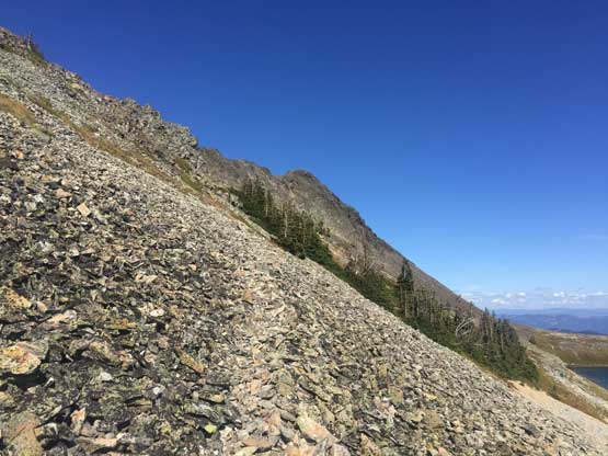 From the broad pass between Coquihalla Mtn. and Jim Kelly Peak we picked a game trail ascending to the next broad pass between Jim Kelly Peak and Illal Mtn., and then ditched some unnecessary gears and food. The game trail seemed to go towards the direction we wanted to we followed it, up and over at least one subsidiary bump to the small alpine lake south of Illal Mountain’s summit plateau. Beyond that lake we ascended some easy scree to the summit.