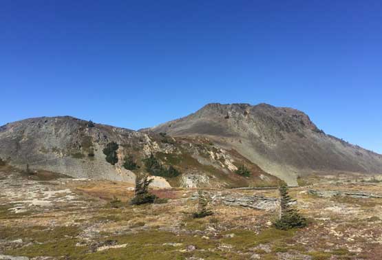 “Illal Mountain” is the unofficial name of the flat-topped bump immediately north of Illal Meadows in the headwaters of Illal Creek. This peak doesn’t boast much peak-bagging interest, but for those scrambling the much-bigger Coquihalla Mtn. a detour to Illal Mtn. only addes less than one additional hour. There’s a photogenic alpine lake on the southern slopes that attracts hikers and overnight campers and overall this zone is fairly popular in the summer months. Connor, Vlad and I opted for this side trip immediately after finishing a traverse of Coquihalla Mountain.