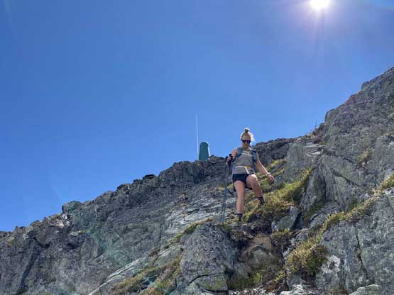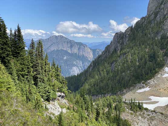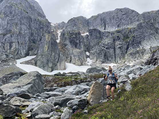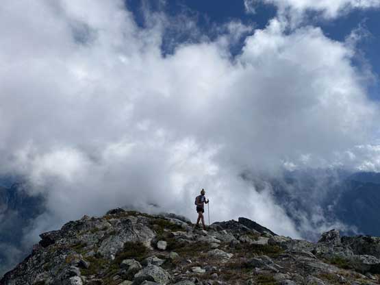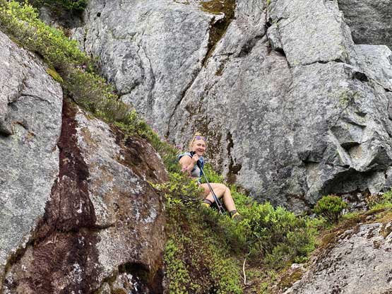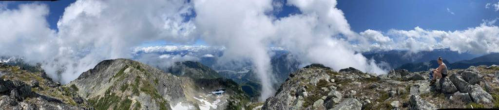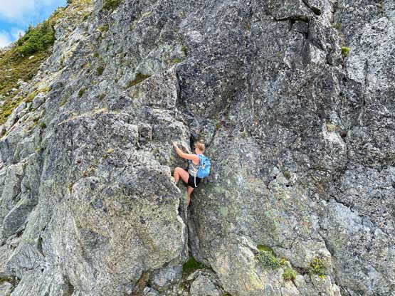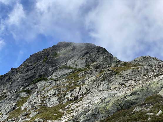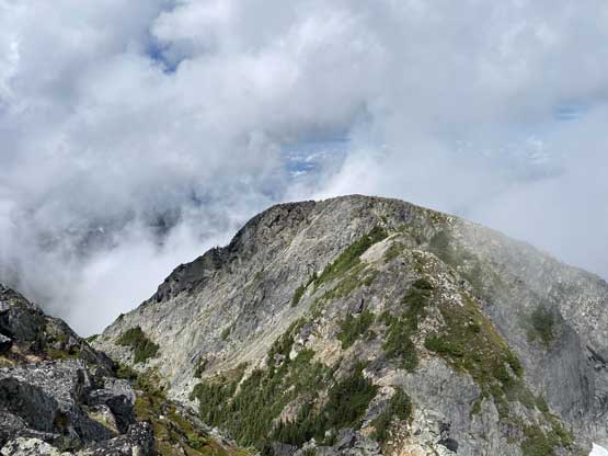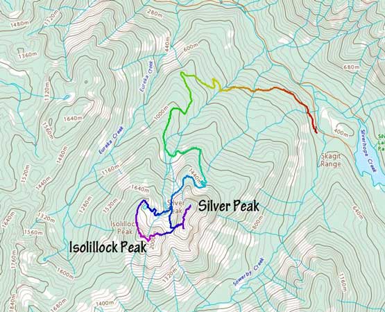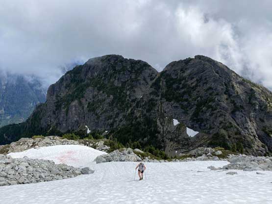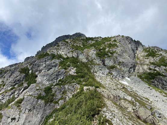 The ascent from Silver/Isolillock col might appear daunting and bushy but in fact it’s neither difficult nor thrashy. We did have to grab some bushes but I would not call this route a “bushwhack”. There were also spots with seeping water on granite slabs but any difficulty could be avoided with some route-finding. I managed to lead us up this ridge keeping the terrain well within “class 2” so any scrambler should be able to do it. Higher up we ascended a mellow field of snow then attacked the summit block via the right hand side skyline ridge. The advantage of this route was that we popped out onto the true summit directly without having to traverse over that sub (west) peak.