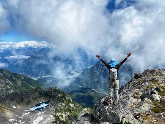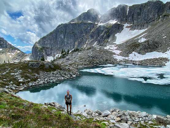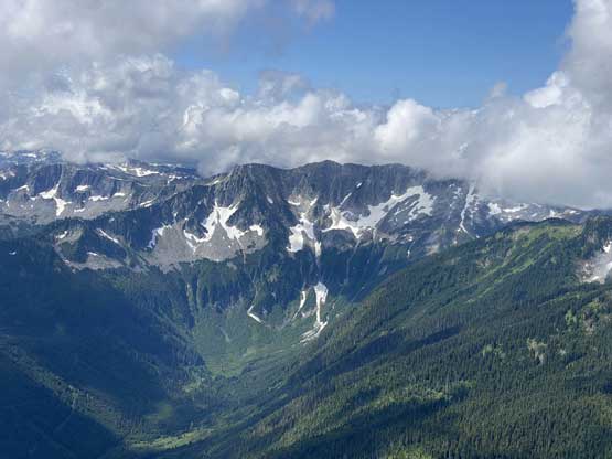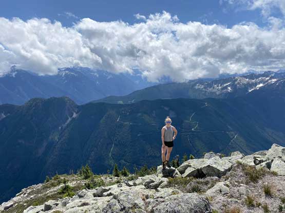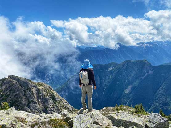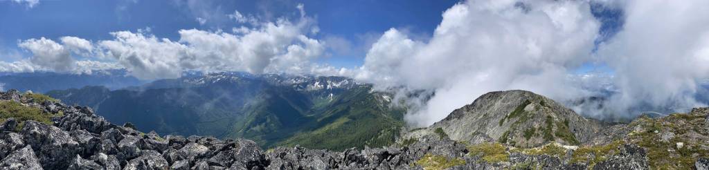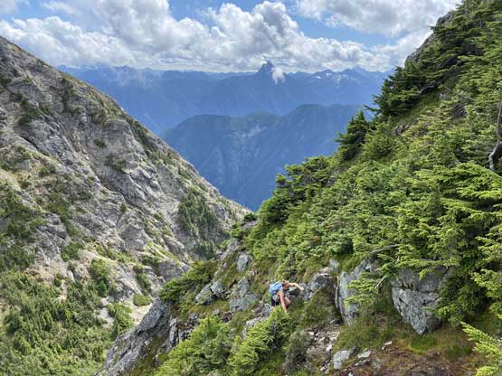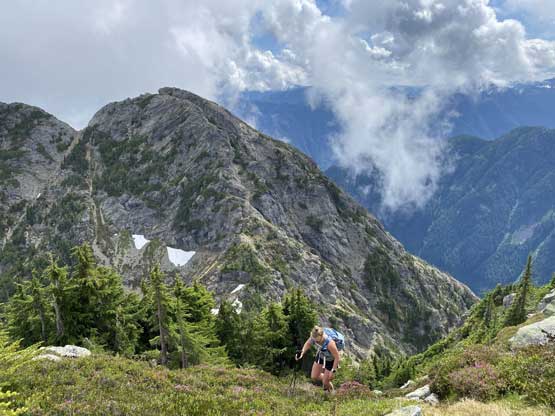 Isolillock Peak is a decently iconic massif that’s extremely visible while driving down the Fraser Canyon road from Yale towards Hope. It rises directly above the town of Hope and the mighty Fraser River for over 2000 m elevation. The ascent is however, not nearly as difficult as it looked from below. This peak was more often done from Sowerby Creek but these days with the beta-sharing of new era is ‘clear that the better attack is from Eureka Mine Road from the north. This approach also gives oppourtunity to combine Isolillock Peak and Silver Peak is one outing. The north ridge is the most logical route on the north side but recent reports had indicated that a direct ascent from Silver/Isolillock col was also very feasible. Christine and I decided to take advantage of all these “beta” to ascend Silver Peak and Isolillock Peak in the most efficient fashion. We drove up Eureka Mine Road to above 1500 m elevation and firstly made an ascent of Silver Peak. Now at Silver/Isolillock col our plan was to traverse Isolillock Peak to make a loop.