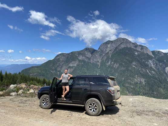 We did not do much research about how to get down from this spot, so I essentially just found our own route based on what we could observe. There’s a bit of bush thrashing to descend to that tarn and from there we stayed a bit too far skier’s left and had to deal with more bush thrashing and tricky down-climbing. After a few ledges I made the call to traverse hard right into the main drainage and from there we had no further difficulty to get down. Christine wanted to go for a swim in that lower tarn but it looked too cold for me, and we were getting hungry. Our trip wasn’t over yet as we still had to drive down that steep road. The worst would be to encounter someone driving up. We did meet one guy but thankfully he’s in his dirt bike. Otherwise this would turn into a nightmare.