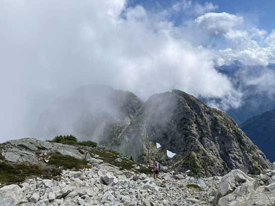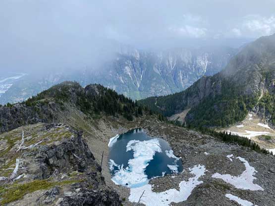 The easiest way down would be to reverse our route but we wanted to get the most out of this peak, so the decision was to traverse the north ridge. The down-climb into the true/false col was mostly class 2 except for one step near the end. Looking back I’m sure we did not find the easiest route but it worked for us so why not. We then easily slogged to the top of that false (west) summit for completion, before descending the easy and gentle north ridge towards a partially thawed tarn. Unfortunately we were mostly in fog in this stage.