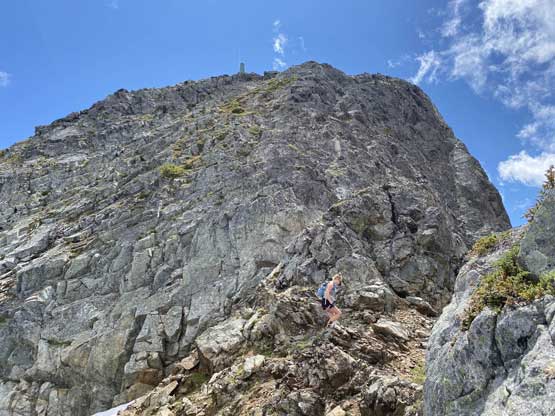 The ascent from Silver/Isolillock col might appear daunting and bushy but in fact it’s neither difficult nor thrashy. We did have to grab some bushes but I would not call this route a “bushwhack”. There were also spots with seeping water on granite slabs but any difficulty could be avoided with some route-finding. I managed to lead us up this ridge keeping the terrain well within “class 2” so any scrambler should be able to do it. Higher up we ascended a mellow field of snow then attacked the summit block via the right hand side skyline ridge. The advantage of this route was that we popped out onto the true summit directly without having to traverse over that sub (west) peak.