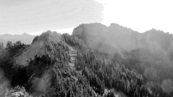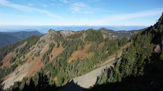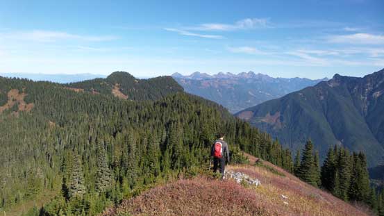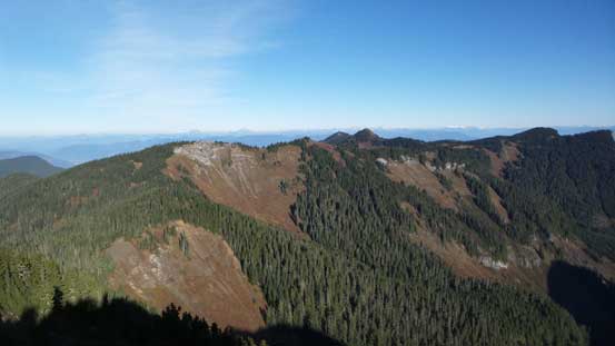 From the summit of “Old Baldy” we dropped down the south side on some open slopes but soon entered the forest again. The trail had become a bit indistinct at sections but essentially it just followed the ridge crest so there’s no reason to get lost. And in fact, we were even surprised by the quality of this path especially given the status of that access road. This section of the ridge was undulating but nothing in terms of “major dips” and in short time we were going up again. A few spots were tight and bushy but nothing terribly ugly and we wasted no time reaching the unnamed high point about 2 km north-west of Liumchen Mountain.