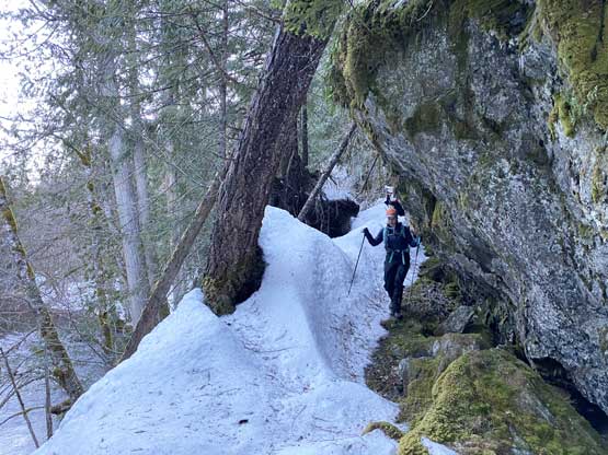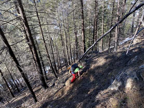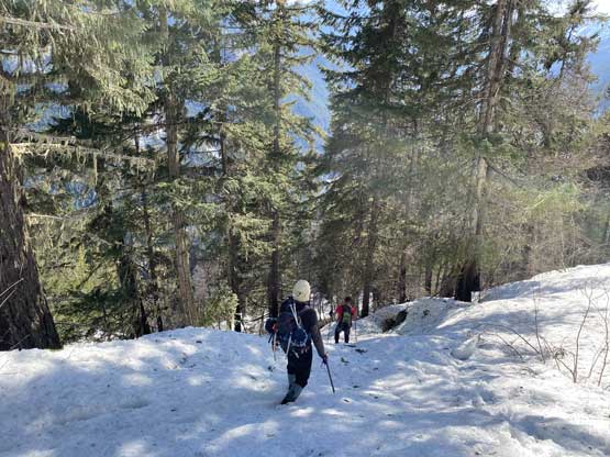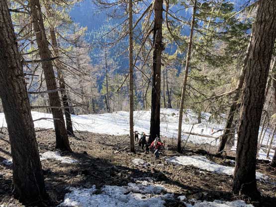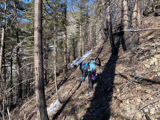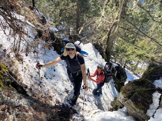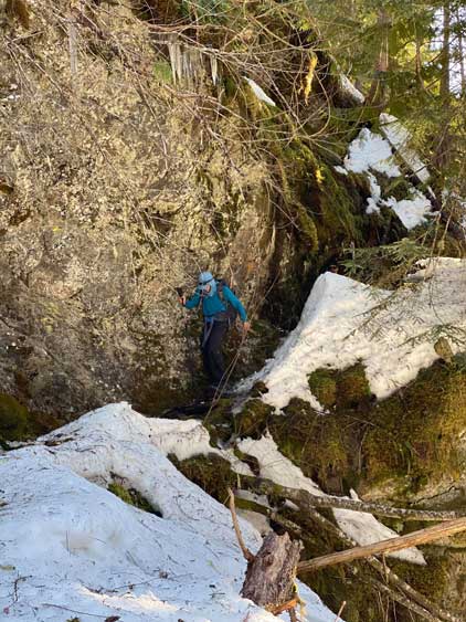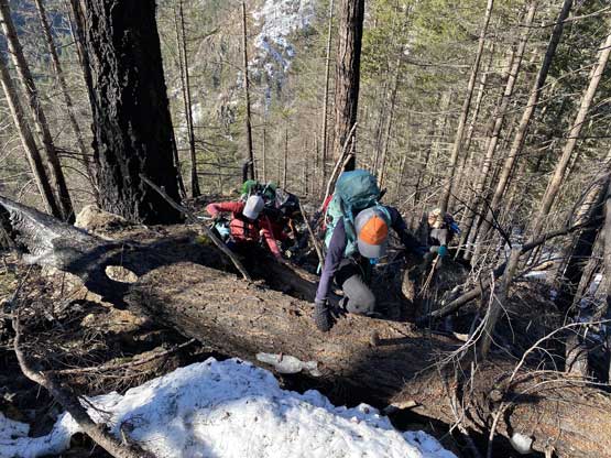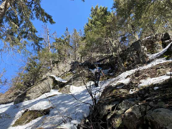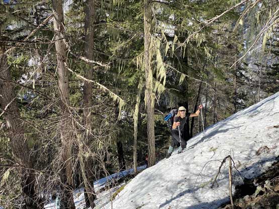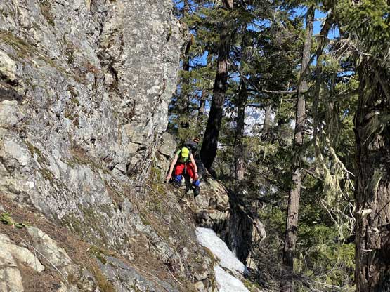 We all took a long break on the opposite side of the river drying out and regaining strength. The next section was to gain the south ridge proper but to get there we had to endure some bushwhacking and hop over some massive dead-falls. While traversing southwards I got tired of the side-hilling and made the call to ascend straight up a large opening area, which started off with snow but the snow soon gave way to loose talus and scree. The grade became increasingly steep to over 40 degrees and we had to start scrambling. To gain the actual ridge wasn’t difficult but involved an awkward leftward traverse with a lot of rockfall hazard. Then up the lower south ridge we had no snow whatsoever for a couple hundred vertical meters. The trade-off for no post-holing was to manage loose rocks. I felt like I was going back to the Rockies as the rocks here were nothing but choss. Once the snow appeared to become continuous we took a food break and strapped the snowshoes on, but the snowshoes came off not long after as we faced another long stretch of dry scrambling. The crux section came unexpected as we faced a vertical cliff band that’s about 1 pitch long with no obvious bypass. I went around to climber’s right side to evaluate different options but in the end we decided to attack the nose, that involved some class 3-4 bush scrambling with moderate exposure. Half an hour later we all cleared this mess and the terrain finally tapered off and we finally could officially start the snowshoeing.