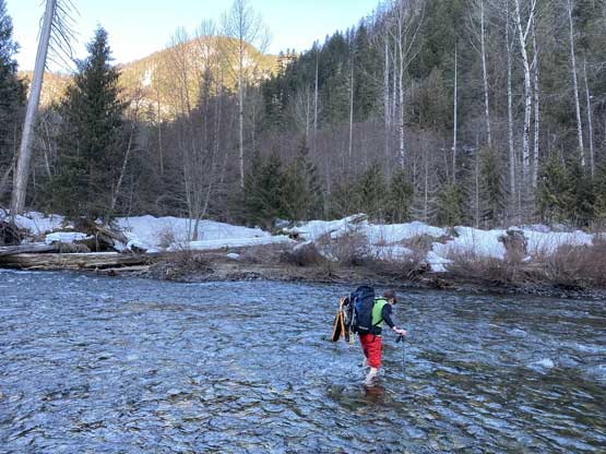 After settling on our objective we sent multiple invites and to our surprise, a total of seven of us signed up – Al, myself, Vlad, Mel, Winnie, Iliya and “the Pink Panther” who didn’t want to be publicised because she called in sick at the last minute in order to join us. I set the starting time of 7 am from the trail-head which meant we all had to get up early. We grouped in Abbotsford and piled into two vehicles. I drove Mel, Vlad and Winnie out east and the other three was a couple minutes behind. The gearing up took very little time because we all knew the importance of being efficient on gear transitions for a long outing like this one. Mel set up the blistering pace as usual, down the packed Skagit River trail in over 5 km/h pace. An hour or so later past Delacy Campground the trail became faint at places. We lost the trail for a couple hundred meters in a dead-fall field and I strapped the snowshoes on. The others still opted to boot-pack and either way worked. We made to the river crossing in exactly 1 hour 40 minutes, more than 8 km down the trail with at least 100 m net elevation loss and numerous annoying up-and-downs. The river was wide but looked tame from a fording perspective, but was very cold as soon as we stepped in.