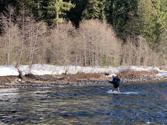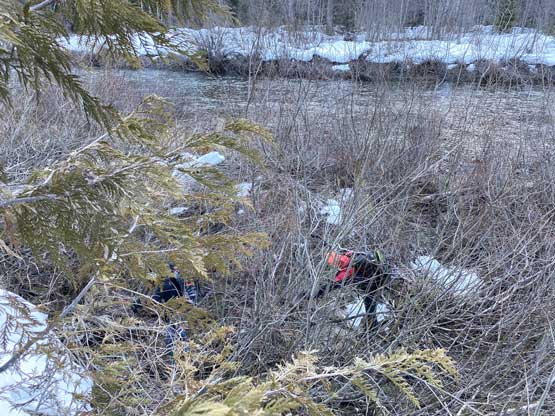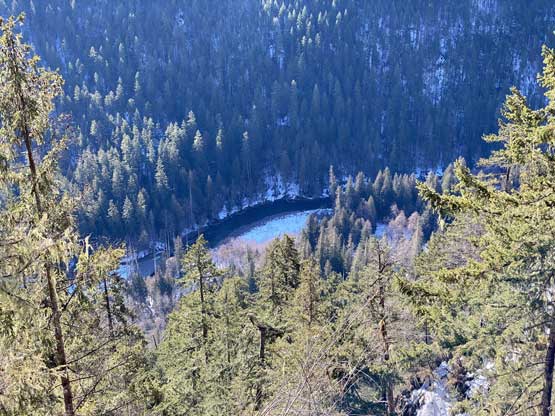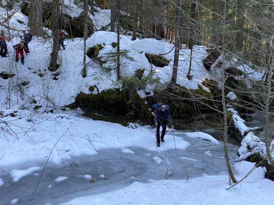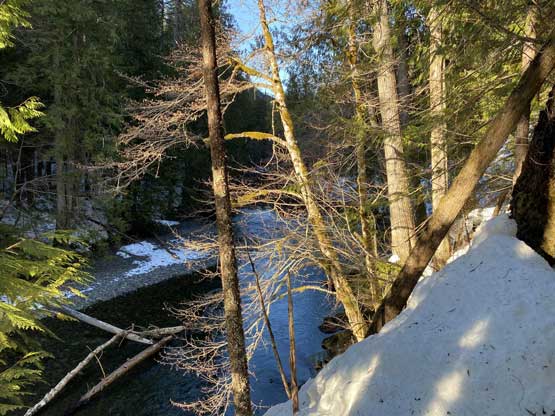 A few of us didn’t give a fuck about the river crossing and did it without even taking the boots off. I did the more civilized way as I brought my river crossing footwear. It was flowing slightly higher than in the morning and was still very cold. Mel and I decided to do the 8 km return hike while keeping snowshoes on as we figured the added traction would contribute to the efficiency. The others decided to just hike while carrying snowshoes. I think we knocked down the depproach in about the same time as our hike-in, so not bad. By the time I got back to the parking lot there was still sun beams depositing on the vehicles.