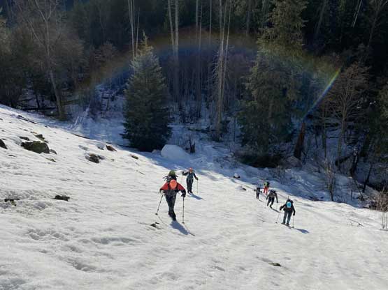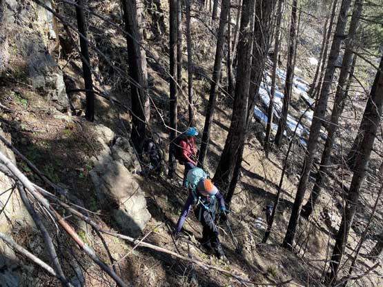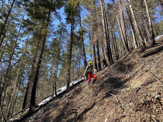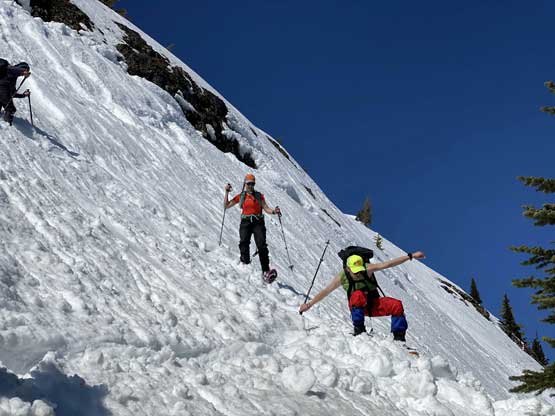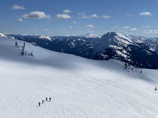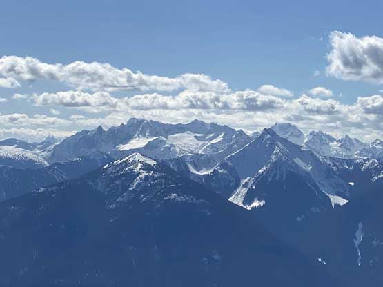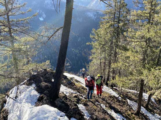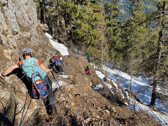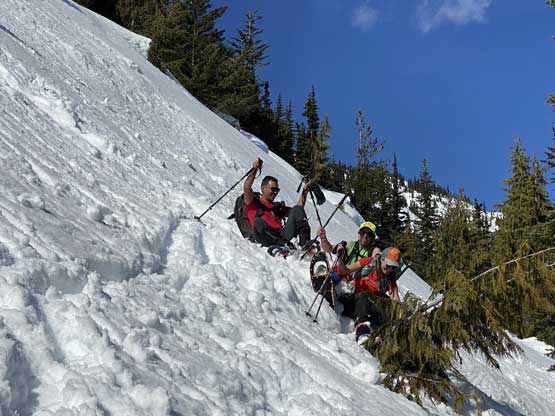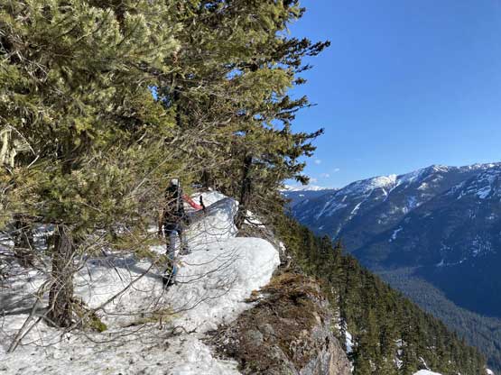 For the descent we all removed the snowshoes and take out the ice axes. The descent only required plunging while facing outwards so it was probably only 40 degrees at the steepest. About halfway down the upper east ridge I discovered a few waist deep holes so made the gear transition back to snowshoes. The others all swapped gears at the roughly same spot, and we regrouped on the upper south ridge. The plunging and glissading down into the bowl and then up onto the middle section of south ridge went by easily. The descent of that steep zone from 1600 m down to 1400 m was also fun as we could glissade most of the steep stretches other than the initial roll. The rest of the snowshoeing on the lower south ridge was not fun at all thank to the shitty, wet snow conditions, but we were expecting it so we just had to suck up the pain and push through the misery. Once the snow ran out the descent on rocks was even worse especially in such a large group. Managing rock-fall was nearly impossible and quite a few of us were nearly hit. We discovered a slightly easier line to get off that crux rock band, and then reversed the exact line we took descending to the Skagit River.
