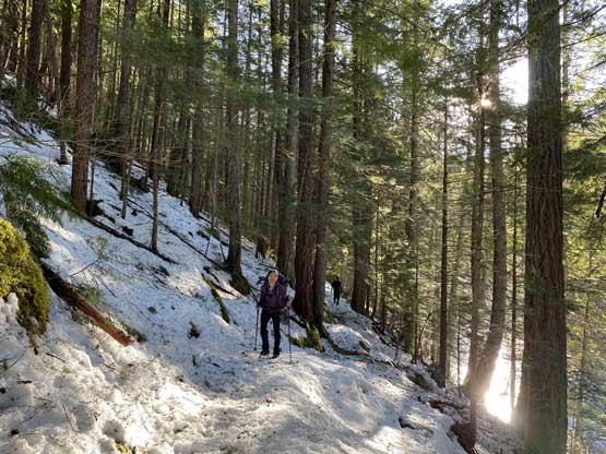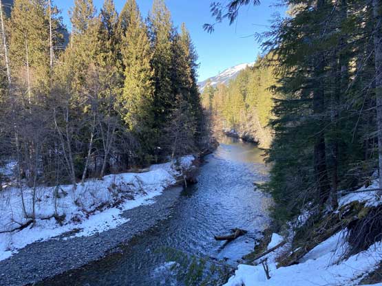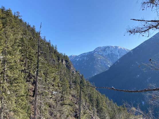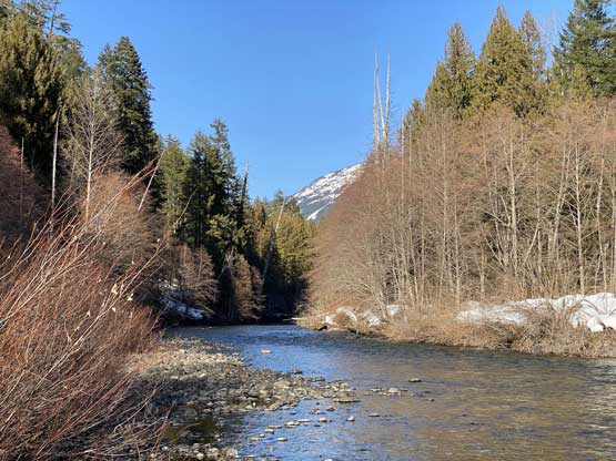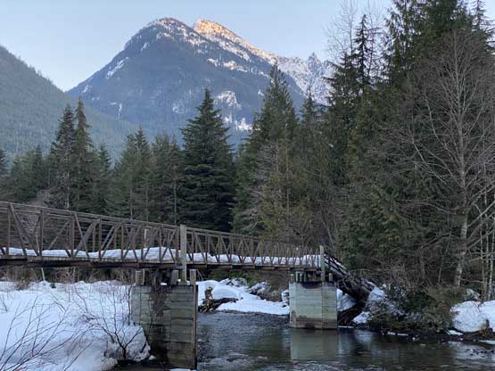 This peak had eluded me for years. It’s very visible from the highway and yet nobody talks about it. The north and east sides of the massif are guarded by some impenetrable cliffs and bluffs as well as Sumallo and Skagit Rivers. By glancing at the maps I did also agree that the west side approach might be the only option, but the 500-m elevation loss from Tearse-Goldtip Ridge was far from appealing. I estimated that with the decommission of the logging roads the west side approach almost certainly needs to be done as an overnight trip. A couple weeks ago Alan Blair reached out to me with a theoretical attack via the south slopes and ridges by wading Skagit River. I had thought about this approach but I never convinced myself that fording a major river like the Skagit on foot would be possible, but after some detailed mapping and digging I did agree that the route above the river would likely go, although not without some steep and uncertain sections. The river would be the biggest uncertainty, but on the way back home from Full Moon Rising a week ago I paid special attention of the water levels and determined that a ford would likely be possible at this time of a year (late winter or early spring). The weather had been good for at leave five days, and the avalanche conditions had dropped to L/L/L across all forecast regions. The last uncertainty was the trail condition as we had to hike 8 km down Skagit River trail from Sumallo Grove, but Al managed to dig out a recent report, from a week ago that the trail was packed to at least 4 km to Delacy Campground.
