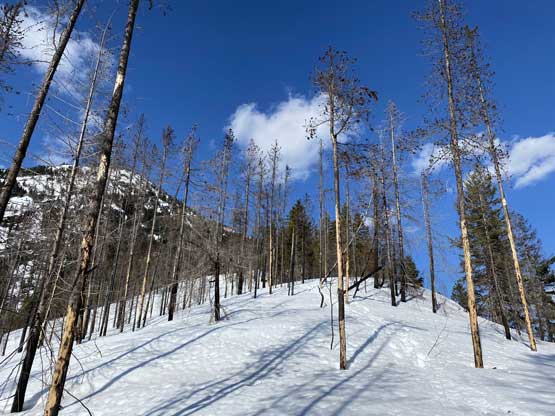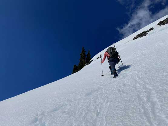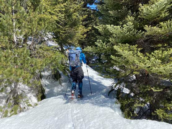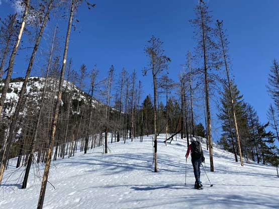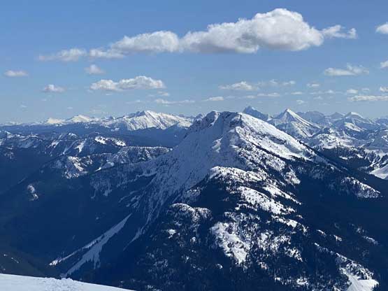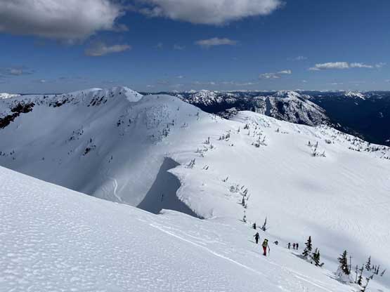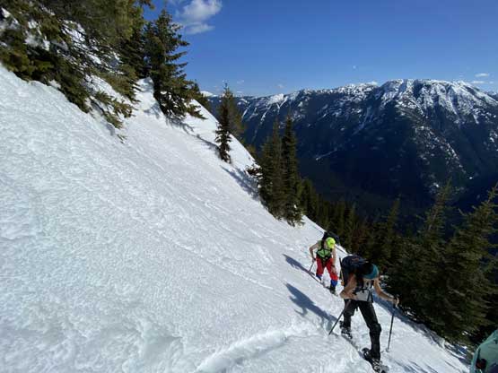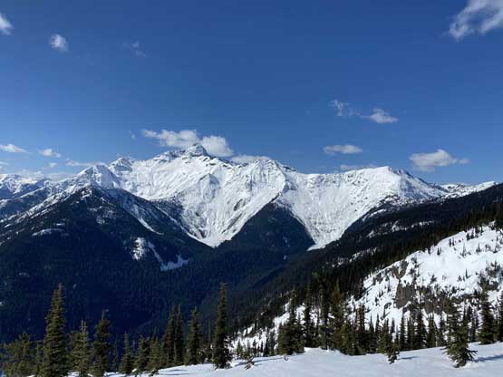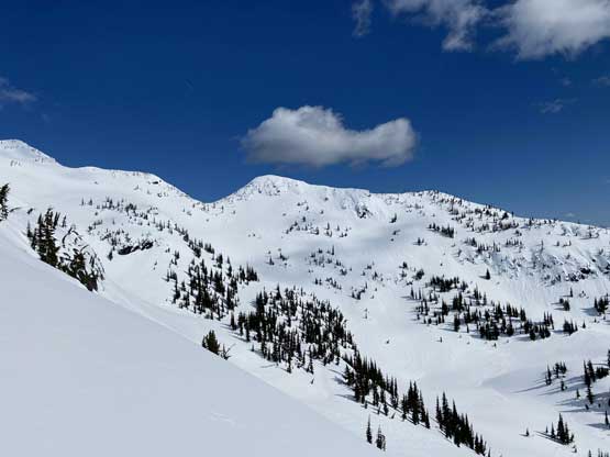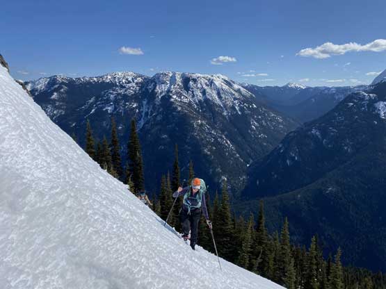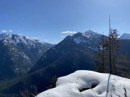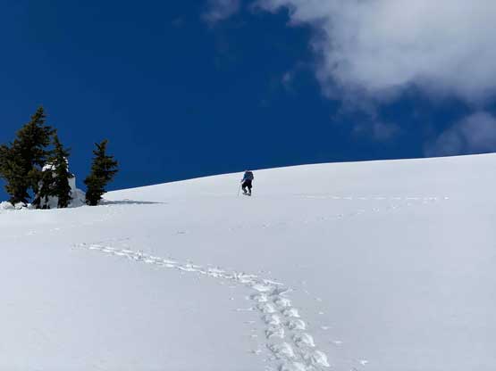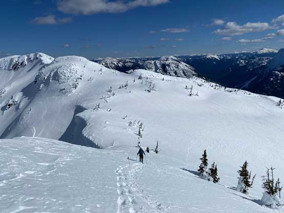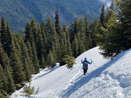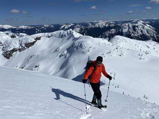 Part of me regretted for not hauling a short rope because such would greatly ease the descent difficulties of this sketchy zone, but for now we wouldn’t need to worry about that yet. The next couple hundred meters of gain was nice and easy but as the grade kicked up again the post-holing soon became challenging. The crust had fully broken down and I sank to knee deep on the wet snow. After a while of post-holing I called for another food break, because I figured the steep stretch from 1400-1600 m needed to be done with fresh mindset as I expected difficult route-finding through bluffs. It turned out that this stretch was easier than I thought, but still not without route-finding challenges. I think we had a higher snow year and that helped, and the low avalanche hazard meant that we could charge the steep open slopes straight up instead of finding a roundabout route. I led at least 3 or 4 stretches with 35 degrees or more, and Mel led the last roll to gain the next section of the south ridge, which was certainly steeper than 40 degrees. The snow was soft though meaning we didn’t have to remove the snowshoes. This middle section of the south ridge offered some unobstructed view of Silvertip Mountain massif but for now we had to focus on the next section, which was easy as all we needed was to go straight up for 100 more vertical meters to the base of the next steep bluffs. Based on my research and the field observation I made the decision to bail into the adjacent bowl, cross the entire bowl and to gain the next ridge west of us as soon as possible. The side-hill descent into the bowl involved some elevation loss but the ascent to the next ridge was less steep than appeared.