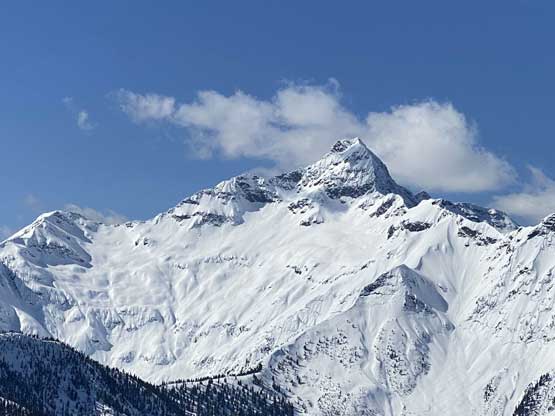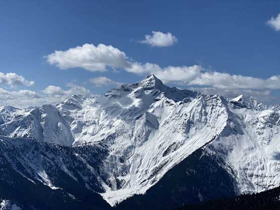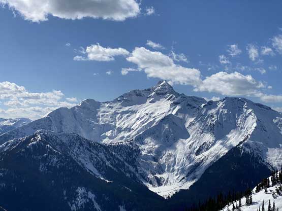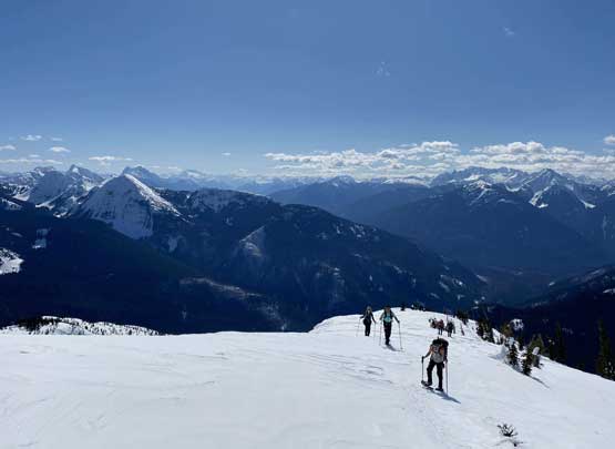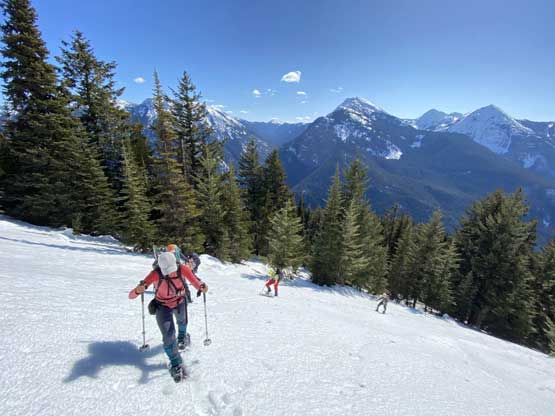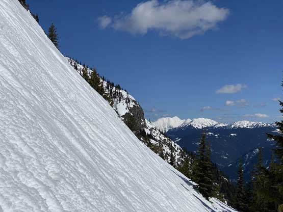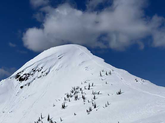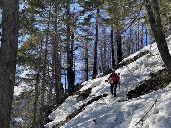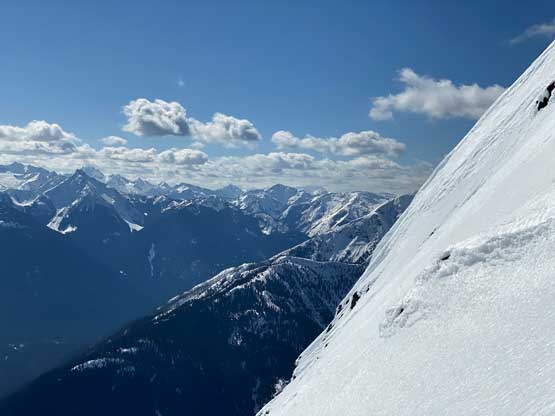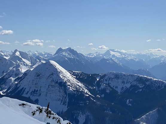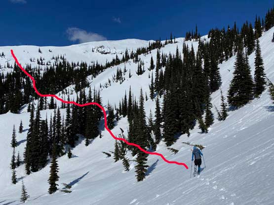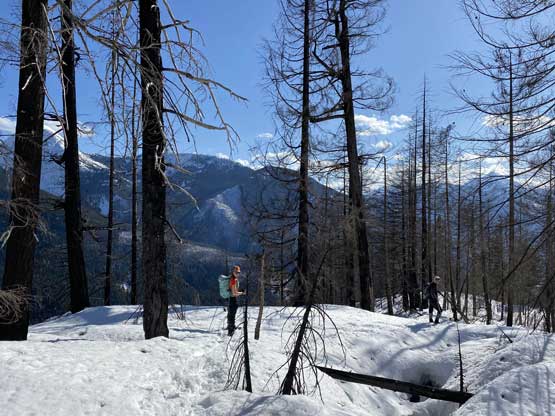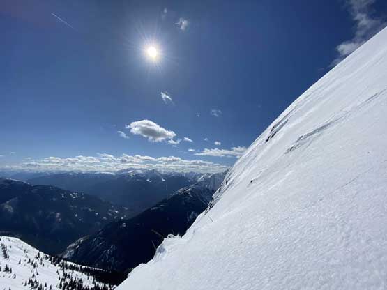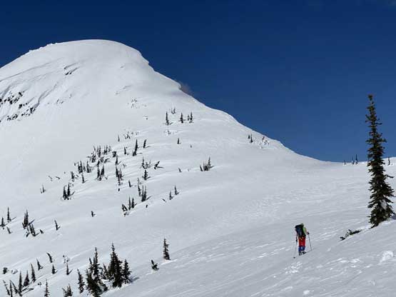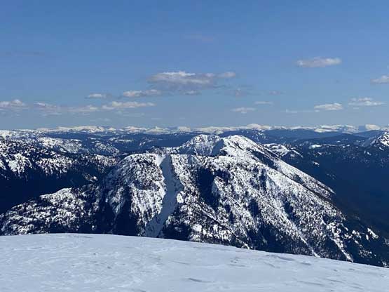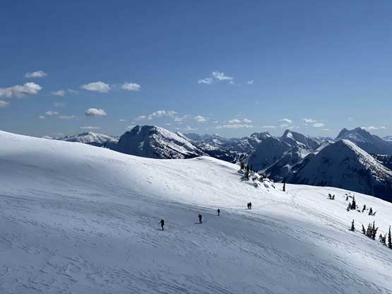 Part of me regretted for not hauling a short rope because such would greatly ease the descent difficulties of this sketchy zone, but for now we wouldn’t need to worry about that yet. The next couple hundred meters of gain was nice and easy but as the grade kicked up again the post-holing soon became challenging. The crust had fully broken down and I sank to knee deep on the wet snow. After a while of post-holing I called for another food break, because I figured the steep stretch from 1400-1600 m needed to be done with fresh mindset as I expected difficult route-finding through bluffs. It turned out that this stretch was easier than I thought, but still not without route-finding challenges. I think we had a higher snow year and that helped, and the low avalanche hazard meant that we could charge the steep open slopes straight up instead of finding a roundabout route. I led at least 3 or 4 stretches with 35 degrees or more, and Mel led the last roll to gain the next section of the south ridge, which was certainly steeper than 40 degrees. The snow was soft though meaning we didn’t have to remove the snowshoes. This middle section of the south ridge offered some unobstructed view of Silvertip Mountain massif but for now we had to focus on the next section, which was easy as all we needed was to go straight up for 100 more vertical meters to the base of the next steep bluffs. Based on my research and the field observation I made the decision to bail into the adjacent bowl, cross the entire bowl and to gain the next ridge west of us as soon as possible. The side-hill descent into the bowl involved some elevation loss but the ascent to the next ridge was less steep than appeared.