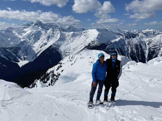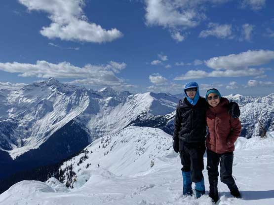 We took the last food break on this ridge studying the route ahead. The “Marmot Mountain” labelled on our topographic maps were wrong as I knew the west peak was actually higher in elevation. The west peak appeared steep though but again, the avalanche condition was low so we should be fine. The snowshoeing up to the base of the uppermost east ridge of the true summit was easy. My plan was to “snow-climb” the upper east ridge but from the base the grade appeared to ease off so I kept charging up on snowshoes. The conditions were also prime for steep snowshoeing too. The upper section was 40 degrees or slightly more, with massive cornices dangling on the right side and steep, exposed run-out on the left; that no mistake was allowed. Still, I was pretty experienced in climbing snow like this on snowshoes so didn’t even bother to take the ice axe out, and soon enough I was on the summit. The others joined soon one by one and we lingered up there for more than half an hour to soak in the success.