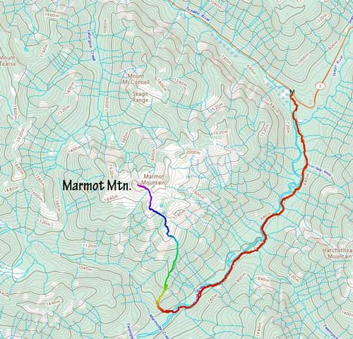 Marmot Mountain is a very obscured summit despite the lack of technical difficulties, and its close proximity to Highway 3 and Manning Park. The peak is at the end of the complex ridge system NE of the much-bigger Silvertip Mtn. but despite that, Marmot Mountain itself is truly a massive with numerous sub-summits, as well as more than 2000 feet of topographic prominence, making it the single most obscured “P2K” objective in the whole Cascade Mountains. This peak has only two or maybe three documented ascents in the last two decades, with the first one by the Washingtonian peak-bagger Grant Myers, who needed this peak to finish his prominence lista and the second one a BCMC trip led by the legendary Alastair Ferries. Both of these ascents were done via the west side by going over “Goldtip Pass”. As the mountaineering history and culture in BC goes, I’m sure this peak had seen more ascents especially back in the old days when the Brown Peak ski area was operating, but records were too old to be found.