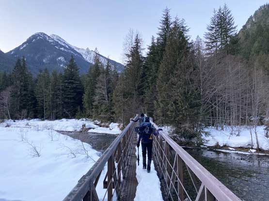 This peak had eluded me for years. It’s very visible from the highway and yet nobody talks about it. The north and east sides of the massif are guarded by some impenetrable cliffs and bluffs as well as Sumallo and Skagit Rivers. By glancing at the maps I did also agree that the west side approach might be the only option, but the 500-m elevation loss from Tearse-Goldtip Ridge was far from appealing. I estimated that with the decommission of the logging roads the west side approach almost certainly needs to be done as an overnight trip. A couple weeks ago Alan Blair reached out to me with a theoretical attack via the south slopes and ridges by wading Skagit River. I had thought about this approach but I never convinced myself that fording a major river like the Skagit on foot would be possible, but after some detailed mapping and digging I did agree that the route above the river would likely go, although not without some steep and uncertain sections. The river would be the biggest uncertainty, but on the way back home from Full Moon Rising a week ago I paid special attention of the water levels and determined that a ford would likely be possible at this time of a year (late winter or early spring). The weather had been good for at leave five days, and the avalanche conditions had dropped to L/L/L across all forecast regions. The last uncertainty was the trail condition as we had to hike 8 km down Skagit River trail from Sumallo Grove, but Al managed to dig out a recent report, from a week ago that the trail was packed to at least 4 km to Delacy Campground.