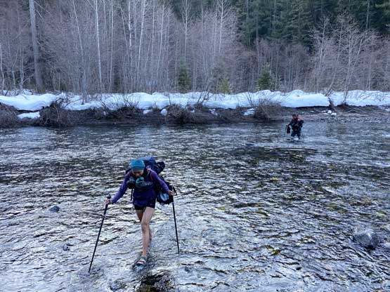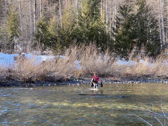 After settling on our objective we sent multiple invites and to our surprise, a total of seven of us signed up – Al, myself, Vlad, Mel, Winnie, Iliya and “the Pink Panther” who didn’t want to be publicised because she called in sick at the last minute in order to join us. I set the starting time of 7 am from the trail-head which meant we all had to get up early. We grouped in Abbotsford and piled into two vehicles. I drove Mel, Vlad and Winnie out east and the other three was a couple minutes behind. The gearing up took very little time because we all knew the importance of being efficient on gear transitions for a long outing like this one. Mel set up the blistering pace as usual, down the packed Skagit River trail in over 5 km/h pace. An hour or so later past Delacy Campground the trail became faint at places. We lost the trail for a couple hundred meters in a dead-fall field and I strapped the snowshoes on. The others still opted to boot-pack and either way worked. We made to the river crossing in exactly 1 hour 40 minutes, more than 8 km down the trail with at least 100 m net elevation loss and numerous annoying up-and-downs. The river was wide but looked tame from a fording perspective, but was very cold as soon as we stepped in.