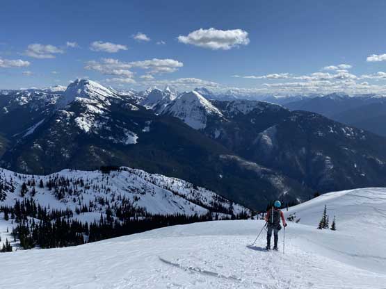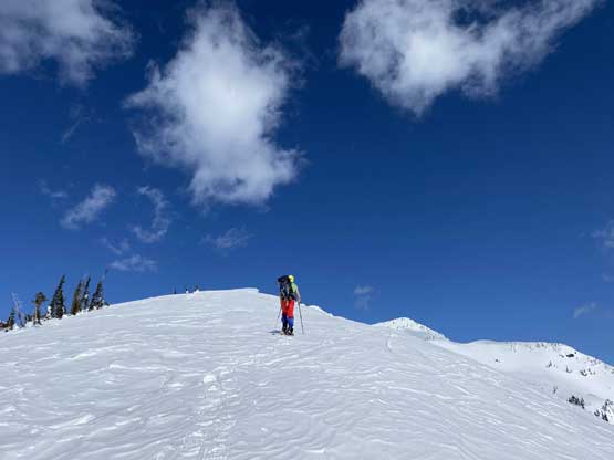 Part of me regretted for not hauling a short rope because such would greatly ease the descent difficulties of this sketchy zone, but for now we wouldn’t need to worry about that yet. The next couple hundred meters of gain was nice and easy but as the grade kicked up again the post-holing soon became challenging. The crust had fully broken down and I sank to knee deep on the wet snow. After a while of post-holing I called for another food break, because I figured the steep stretch from 1400-1600 m needed to be done with fresh mindset as I expected difficult route-finding through bluffs. It turned out that this stretch was easier than I thought, but still not without route-finding challenges. I think we had a higher snow year and that helped, and the low avalanche hazard meant that we could charge the steep open slopes straight up instead of finding a roundabout route. I led at least 3 or 4 stretches with 35 degrees or more, and Mel led the last roll to gain the next section of the south ridge, which was certainly steeper than 40 degrees. The snow was soft though meaning we didn’t have to remove the snowshoes. This middle section of the south ridge offered some unobstructed view of Silvertip Mountain massif but for now we had to focus on the next section, which was easy as all we needed was to go straight up for 100 more vertical meters to the base of the next steep bluffs. Based on my research and the field observation I made the decision to bail into the adjacent bowl, cross the entire bowl and to gain the next ridge west of us as soon as possible. The side-hill descent into the bowl involved some elevation loss but the ascent to the next ridge was less steep than appeared.