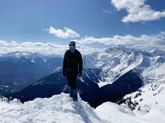 We took the last food break on this ridge studying the route ahead. The “Marmot Mountain” labelled on our topographic maps were wrong as I knew the west peak was actually higher in elevation. The west peak appeared steep though but again, the avalanche condition was low so we should be fine. The snowshoeing up to the base of the uppermost east ridge of the true summit was easy. My plan was to “snow-climb” the upper east ridge but from the base the grade appeared to ease off so I kept charging up on snowshoes. The conditions were also prime for steep snowshoeing too. The upper section was 40 degrees or slightly more, with massive cornices dangling on the right side and steep, exposed run-out on the left; that no mistake was allowed. Still, I was pretty experienced in climbing snow like this on snowshoes so didn’t even bother to take the ice axe out, and soon enough I was on the summit. The others joined soon one by one and we lingered up there for more than half an hour to soak in the success.