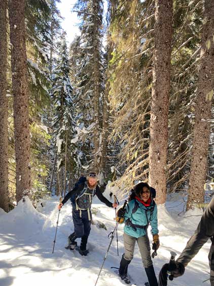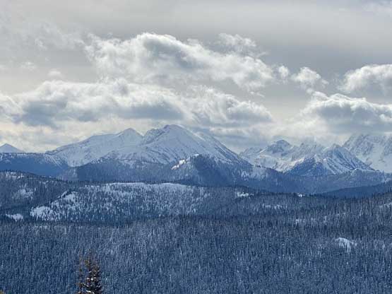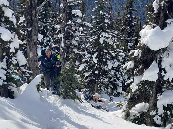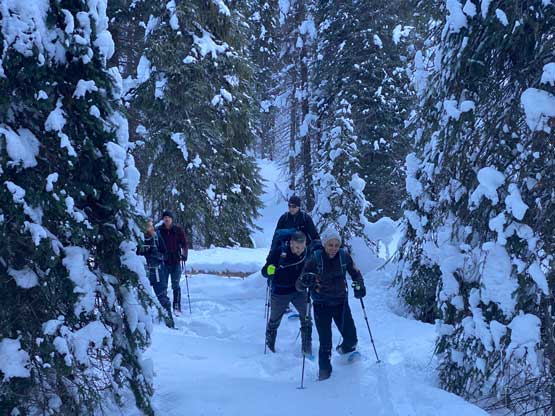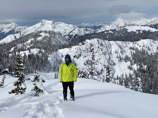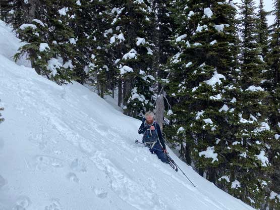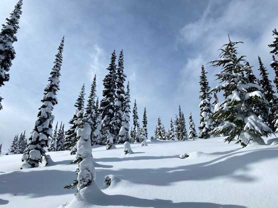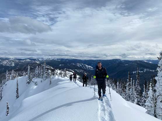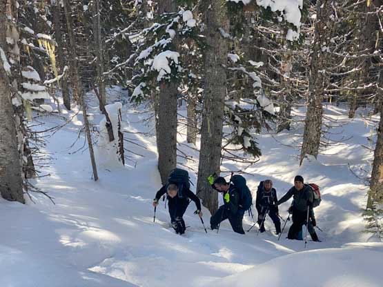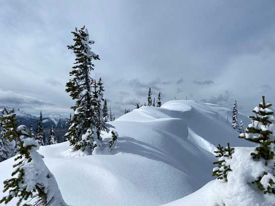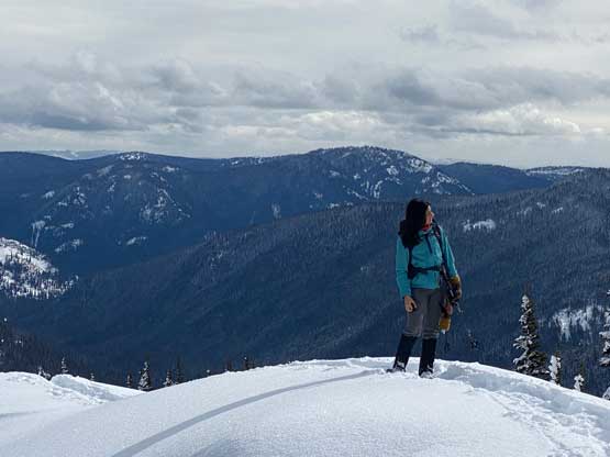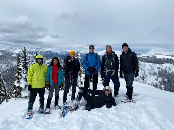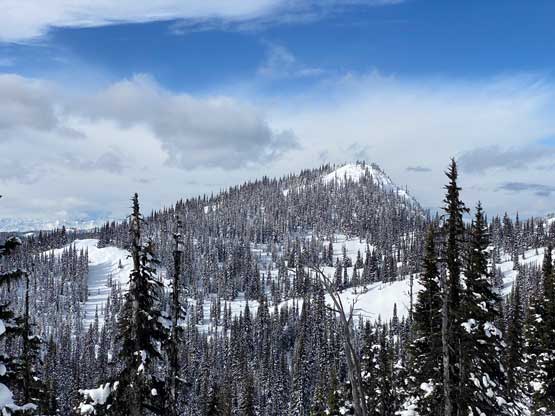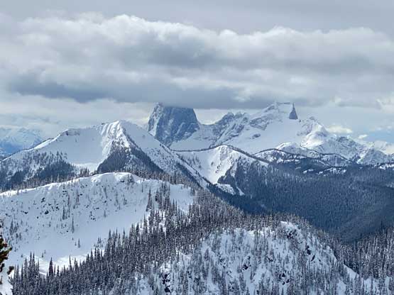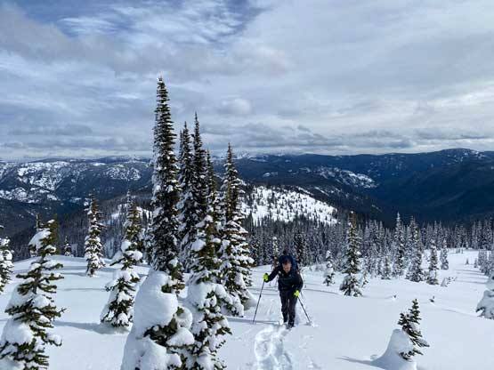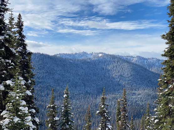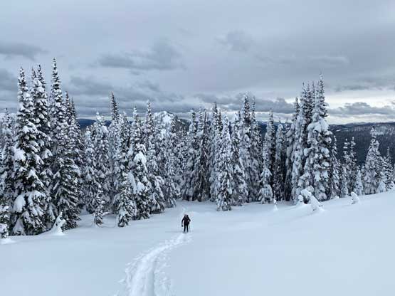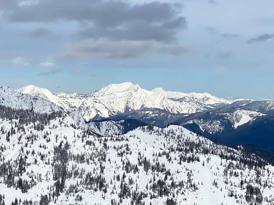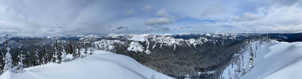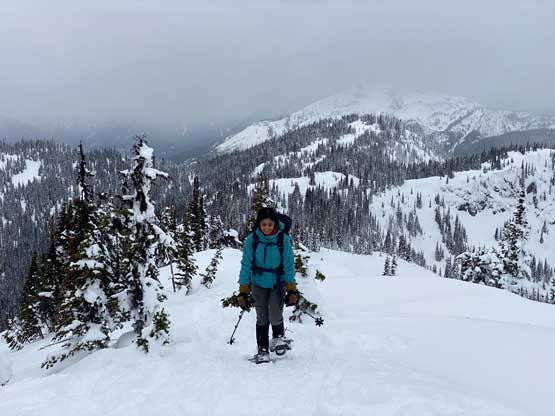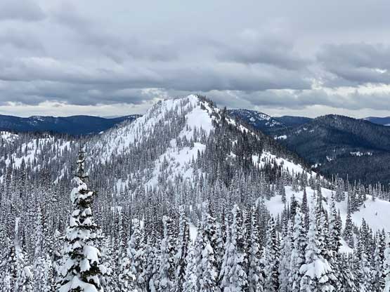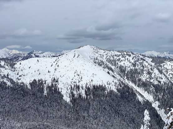 The next stage was a straight-up grunt onto the east ridge system of “Memaloose Peak” while gaining close to 400 m elevation. The slope angle wasn’t ridiculously steep but the snow condition was brutal. A combination of the bottomless sugar and a breakable crust meant the 30′ snowshoes were essentially “critical” for the job. Near the ridge top I opted to ignore the downloaded GPX tracks and led us traversing leftwards across some open slopes. The purpose was to bypass the first bump and the associated unnecessary elevation gain/loss/regain. We then mostly followed the broad and forested ridge crest plodding towards Memaloose Peak but we also did some side-hilling on the steeper south side slopes. On one occasion a few of us heard a large “whump” but the slope wasn’t steep enough to let loose. The avalanche forecast was “M/L/L” on this day and our zone should be considered as treeline, so that “whump” was quite surprising. We then regained the ridge and made the undulating plod to the summit of Memaloose Peak. A few minutes after arriving the sky had turned completely overcast so we timed it reasonably well.