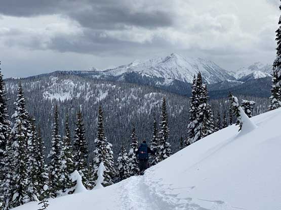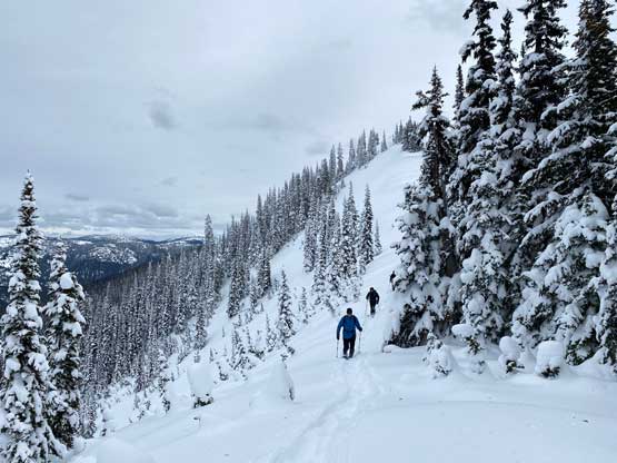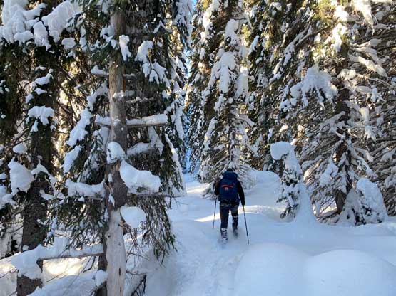 The forecast was calling for clear skies in the morning but increasing clouds with flurries later in the day. Raphael was setting a blistering pace right from the start but I wasn’t sure if he was racing against the weather or just wanted to be quick. A kilometer or two later about 1/3 of the way into this Memaloose Creek approach the trench made by previous parties disappeared so we were on our own trail-breaking from the early stage. This was not as expected. Matt L. and I took over the lead once the trail-breaking began. There was a faint track and some flagging tapes to follow but the trail wasn’t very obvious at places. We ended up losing the trail but regained it quickly after some cross-country travel. There was also a lot of micro-terrain in the valley with up-and-downs that would become annoying later.