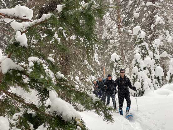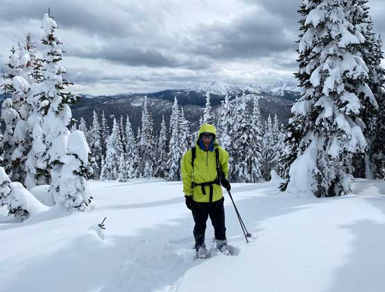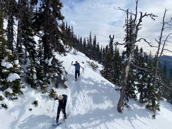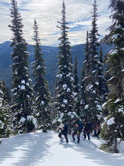 The next stage was a straight-up grunt onto the east ridge system of “Memaloose Peak” while gaining close to 400 m elevation. The slope angle wasn’t ridiculously steep but the snow condition was brutal. A combination of the bottomless sugar and a breakable crust meant the 30′ snowshoes were essentially “critical” for the job. Near the ridge top I opted to ignore the downloaded GPX tracks and led us traversing leftwards across some open slopes. The purpose was to bypass the first bump and the associated unnecessary elevation gain/loss/regain. We then mostly followed the broad and forested ridge crest plodding towards Memaloose Peak but we also did some side-hilling on the steeper south side slopes. On one occasion a few of us heard a large “whump” but the slope wasn’t steep enough to let loose. The avalanche forecast was “M/L/L” on this day and our zone should be considered as treeline, so that “whump” was quite surprising. We then regained the ridge and made the undulating plod to the summit of Memaloose Peak. A few minutes after arriving the sky had turned completely overcast so we timed it reasonably well.