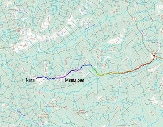 These two peaks in Manning Park are better done in winter. “Memaloose Peak” is the highest summit in the headwaters of Memaloose Creek. Despite the unofficial status this is a very legit summit with 300 m prominence that also offers a 360-degree panoramic view on a clear day, and because of that this peak has gained some popularity over the past few years. “Nara Peak” however, is an unofficially-named forested bump on the west ridge extension of “Memaloose Peak”. According to bivouac.com the name “Nara” was derived from a city of Japan. I absolutely have no idea how this area is related to Japan so I don’t like this name. “Nara Peak” does boast over 100 m prominence so I do consider it as an independent summit, although I’m fairly certain that only the stubborn peak-baggers would consider the out-and-back extension to “Nara Peak” after making the already-long slog to “Memaloose Peak”.