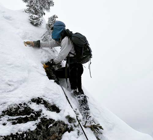 Mel demonstrates what I meant by “technical snowshoeing”…